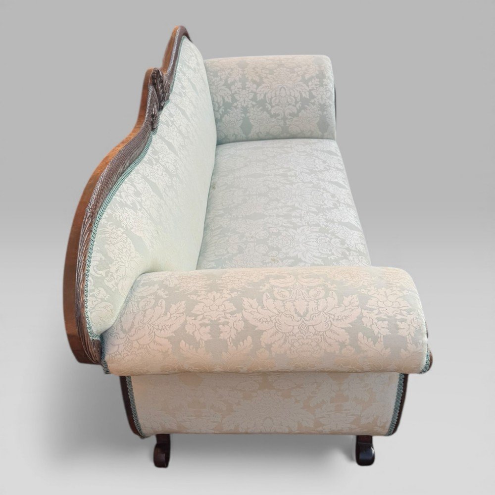 The arms are carved as winged eagles — a typical Empire motif drawn from classical and Napoleonic symbolism. Their detailing is clear, well-proportioned, and characteristic of the style. The sofa is raised on scrolling feet that complete its balanced and elegant profile.