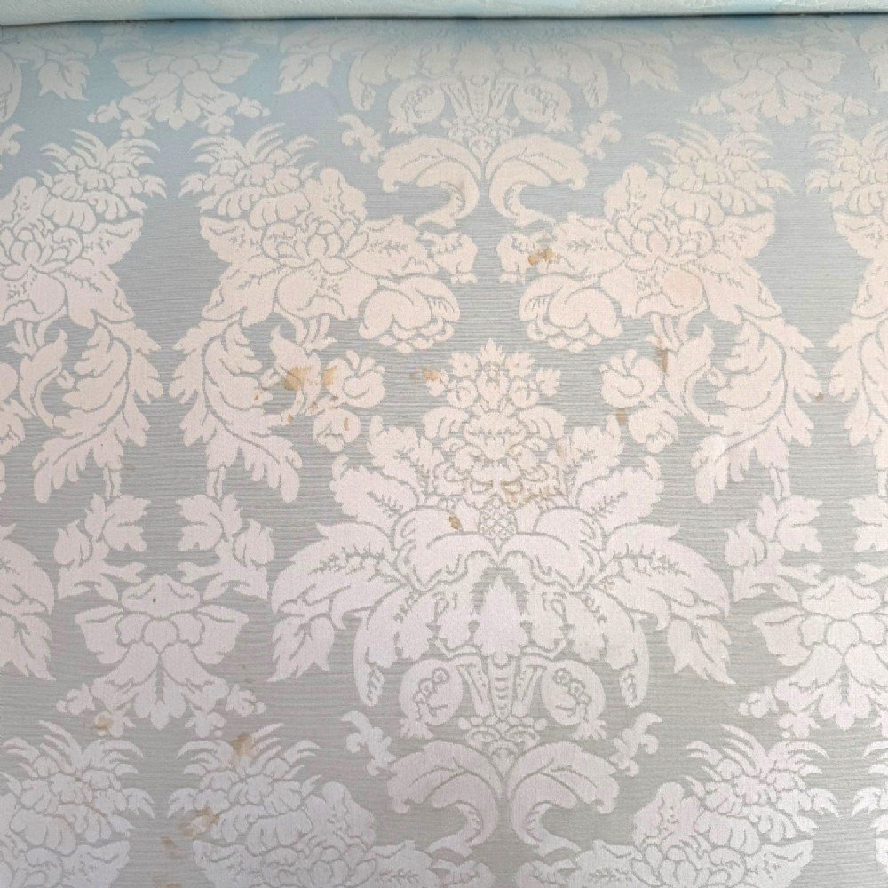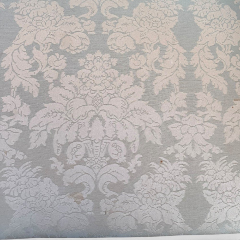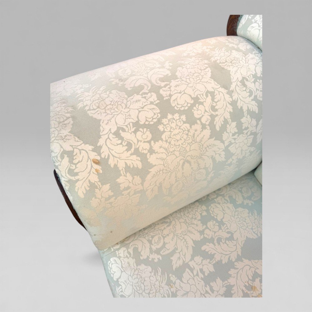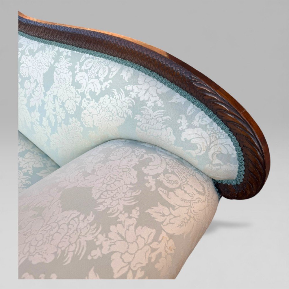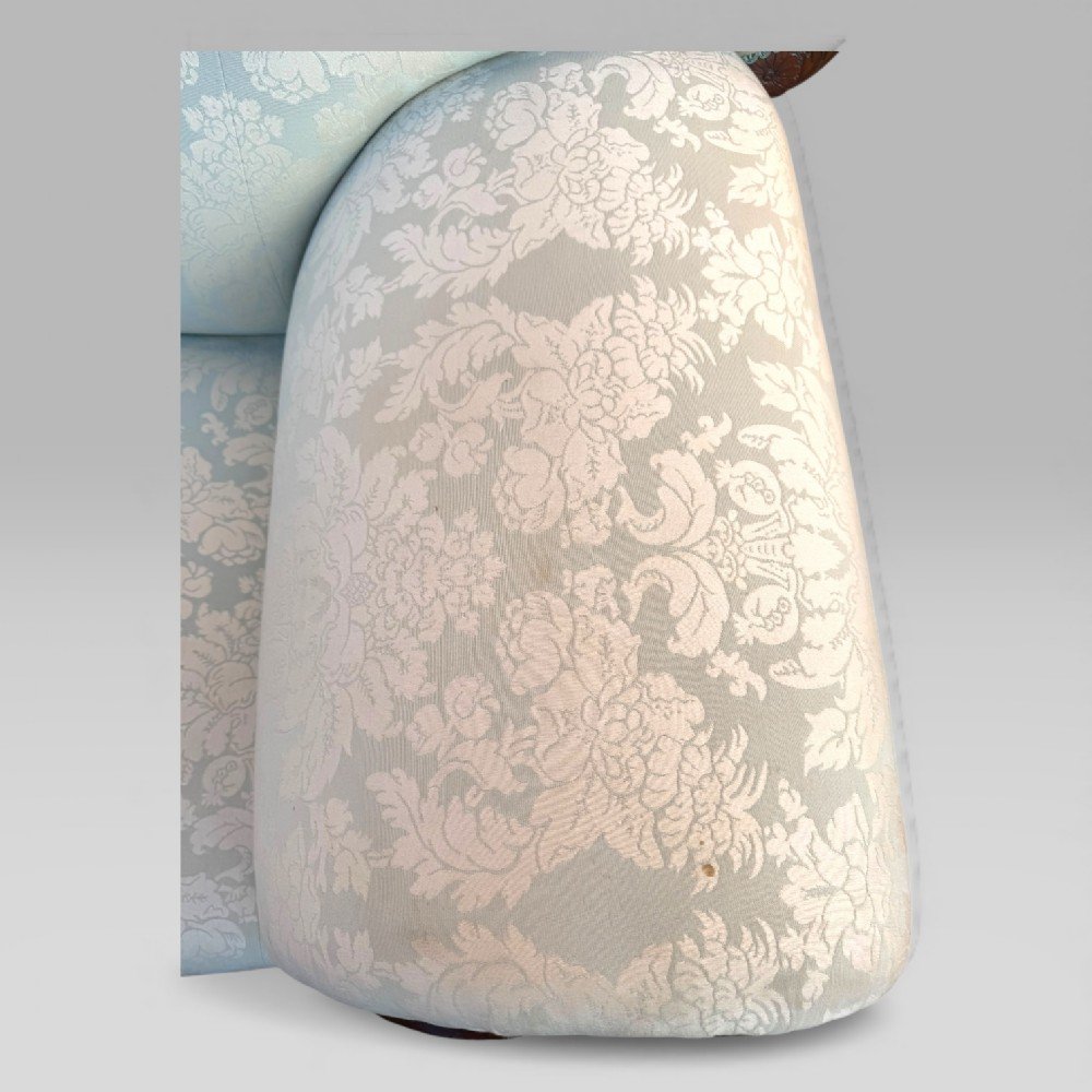 The frame is constructed from richly figured flame mahogany and remains in very good condition for its age of more than 180 years. The upholstery, refreshed within the last 20 years, is a soft blue floral fabric — so light it is almost mistaken for white — adding a gentle decorative touch without distracting from the carved timber. There are a few light marks to the fabric (please see photos).