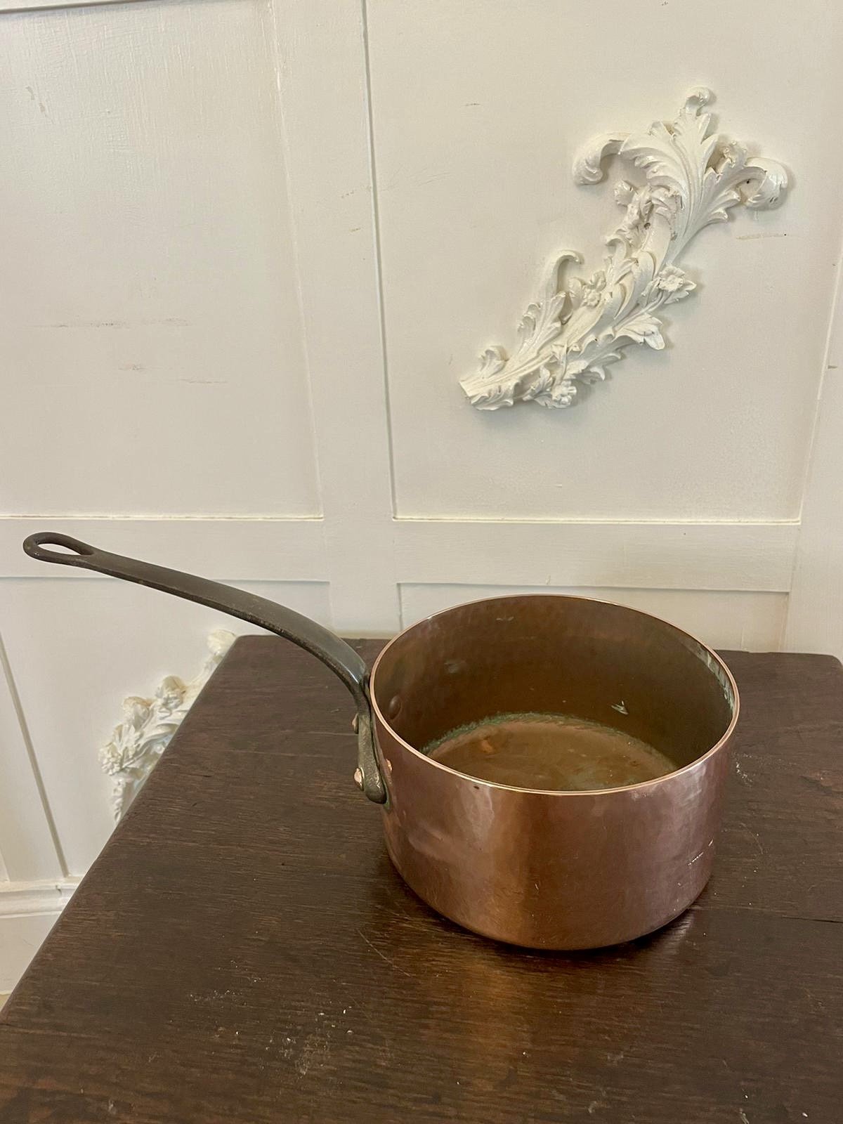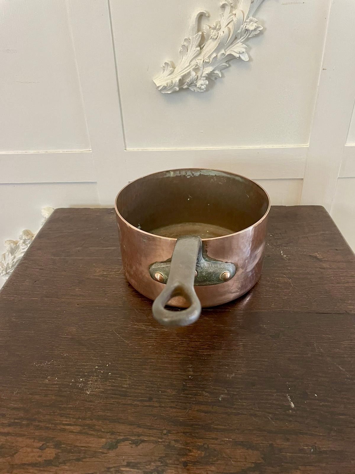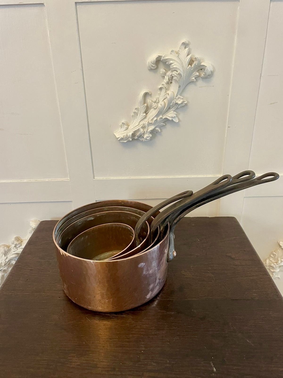 Antique Victorian French set of four copper pans of circular form having a tempered copper base, iron handles with copper rivets and hanging holes. They are heavier than the average copper saucepan