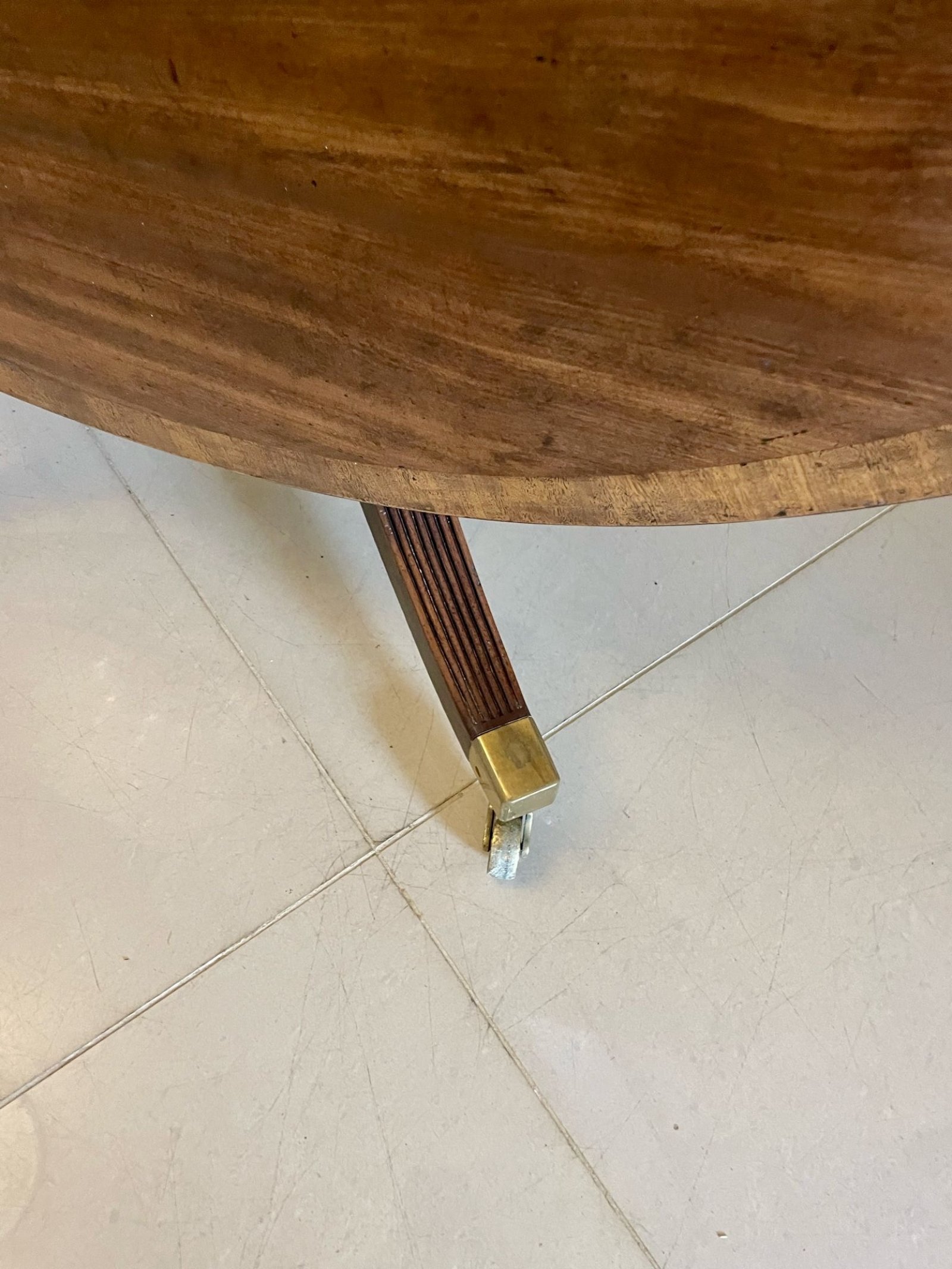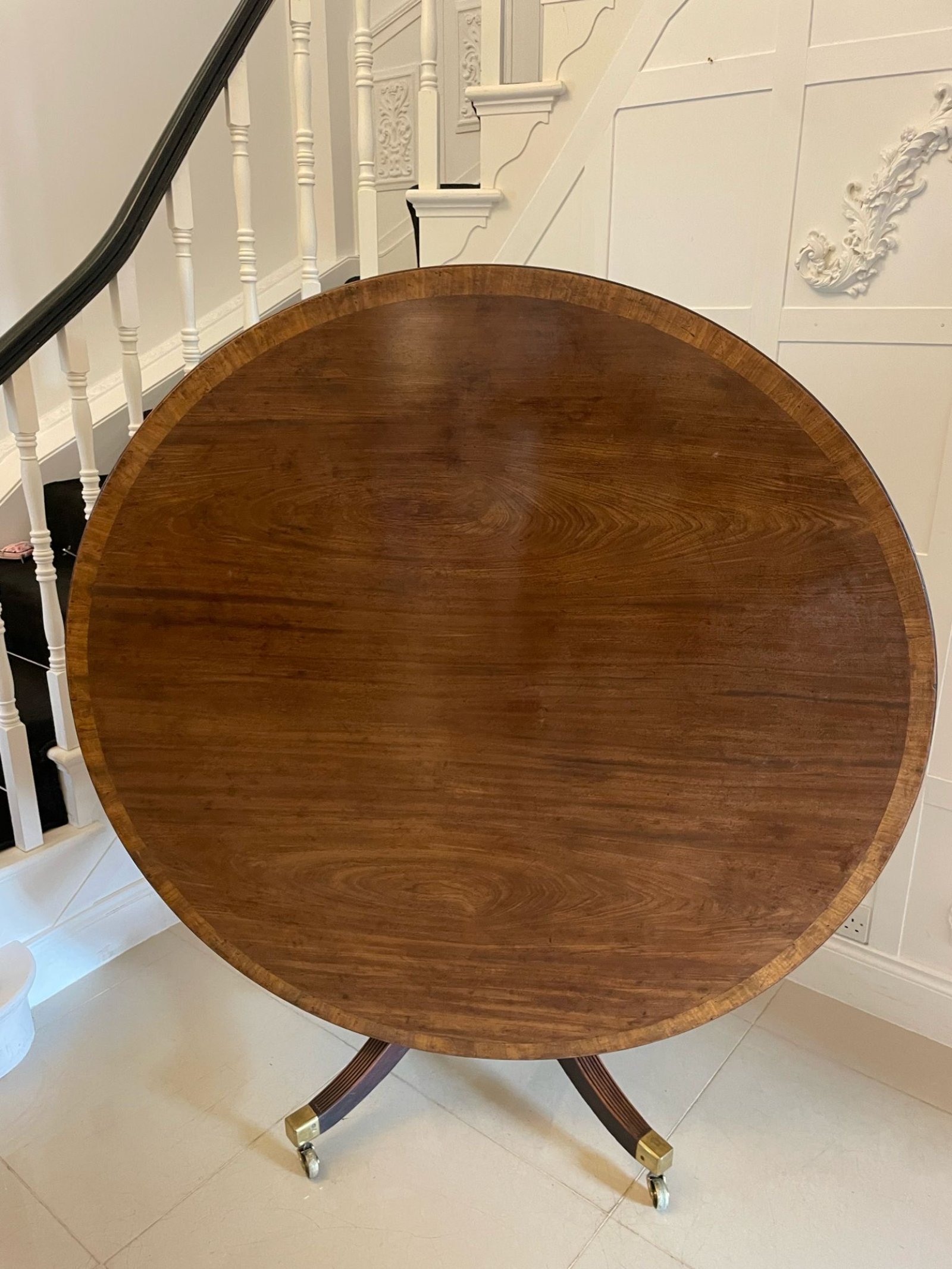 Antique 8 seater George III quality figured mahogany circular dining table having a quality figured mahogany satinwood crossbanded circular top supported by a turned pedestal column standing on four reeded sabre legs with original brass castors
