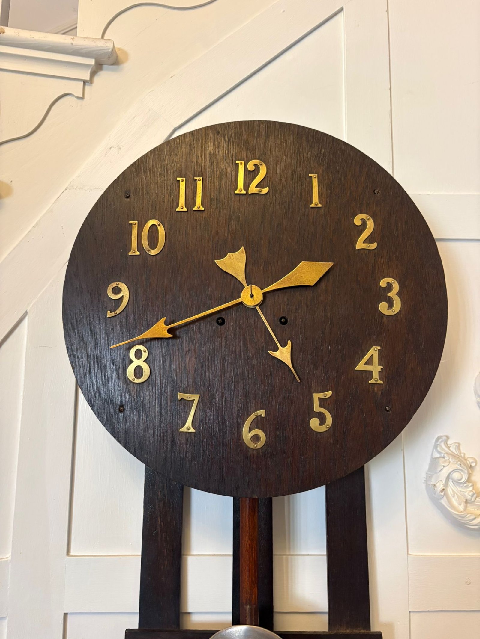 The shaped oak frame with vertical supports and pendulum below reflects the Arts and Crafts emphasis on craftsmanship, simplicity and quality materials, avoiding unnecessary ornament while still offering strong visual presence.