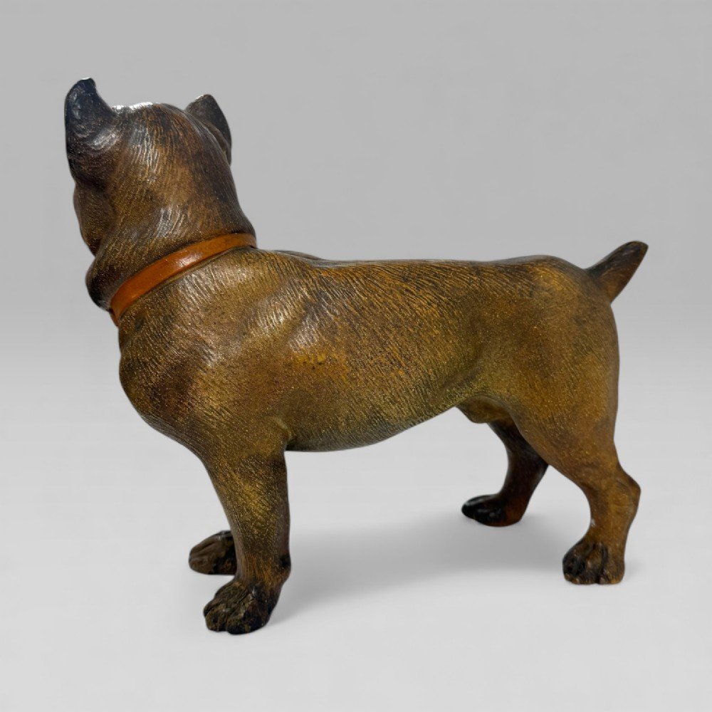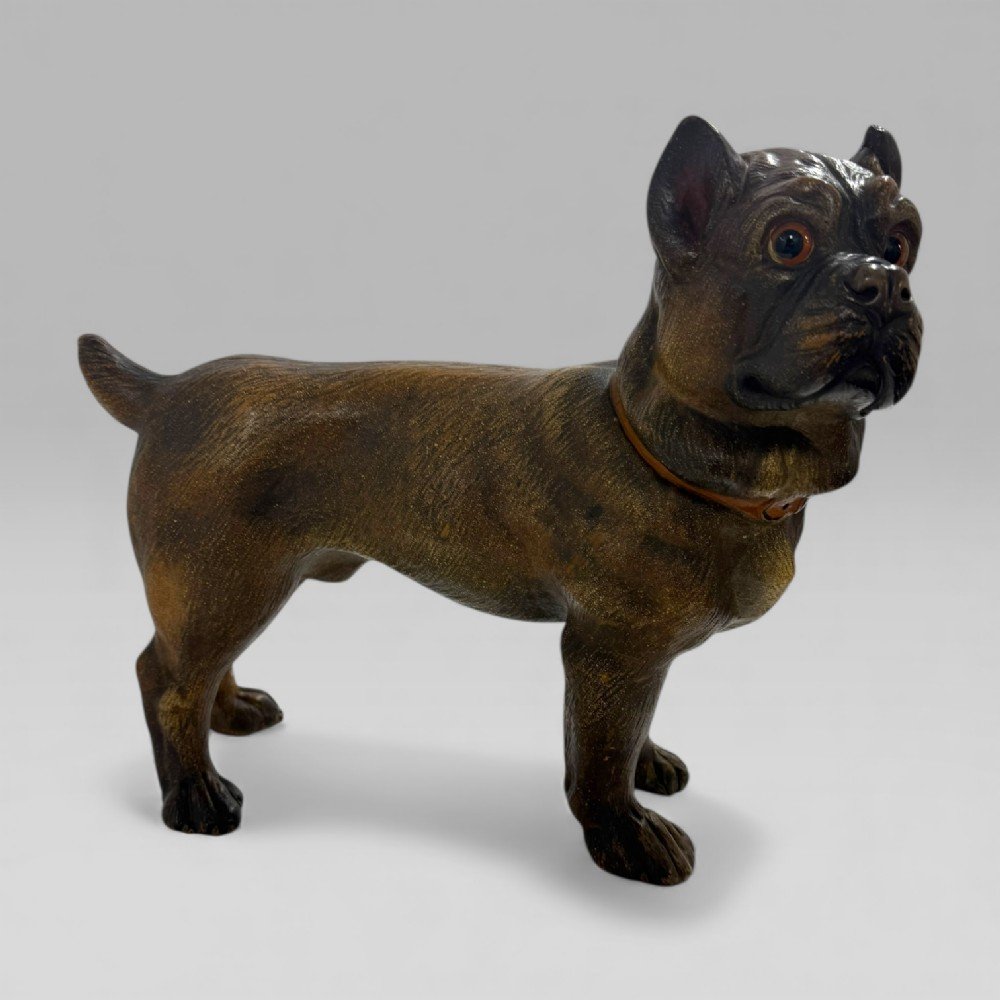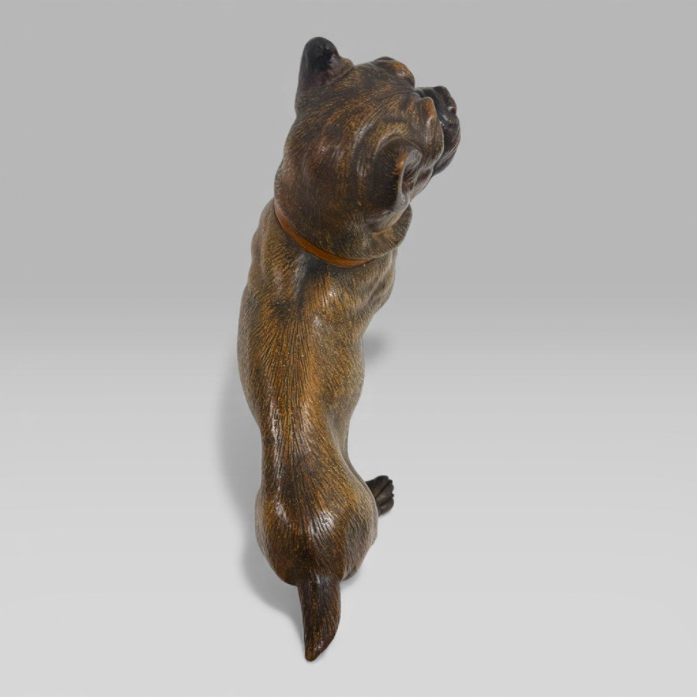 See shipping detailsAn antique late 19th century Austrian terracotta life-size pug puppy, modelled standing on all four legs and wearing a collar. The sculpture captures a playful and confident young dog character, with the chest held upright and a charming puppy expression.