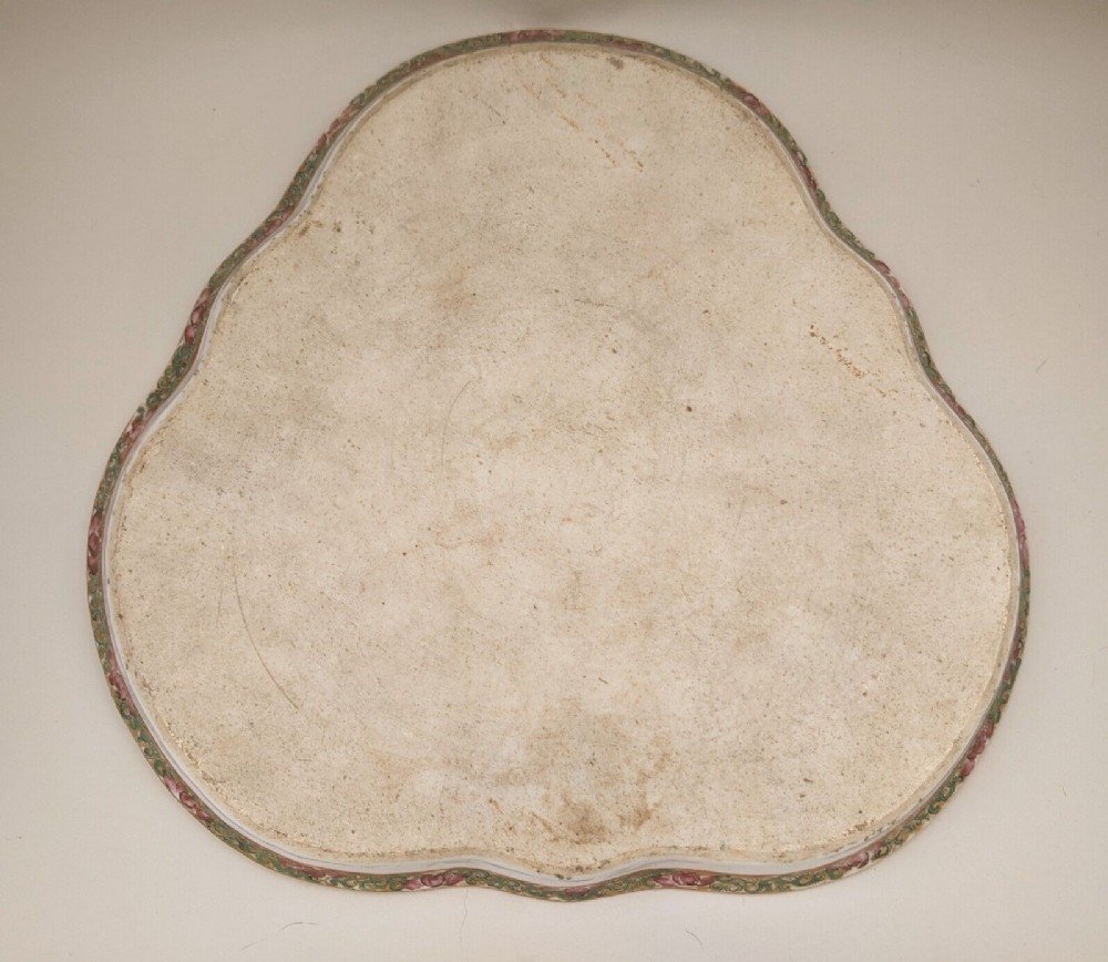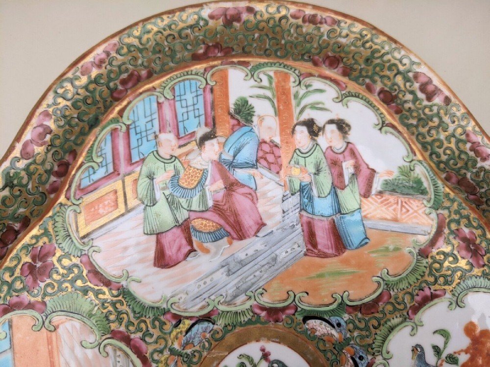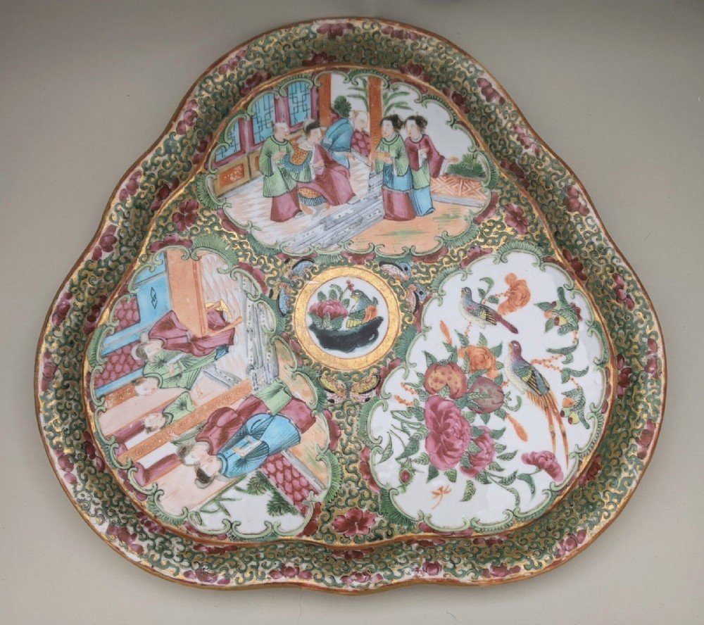 This is a good 19th century Chinese Famille Rose trefoil dish in perfect condition dating from around 1870. The dish is profusely hand decorated and gilded with images of figures on a pagoda terrace and has delightful floral panel with birds and flowers.