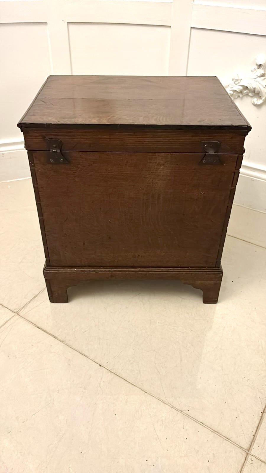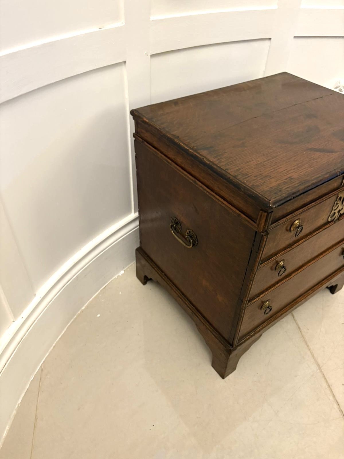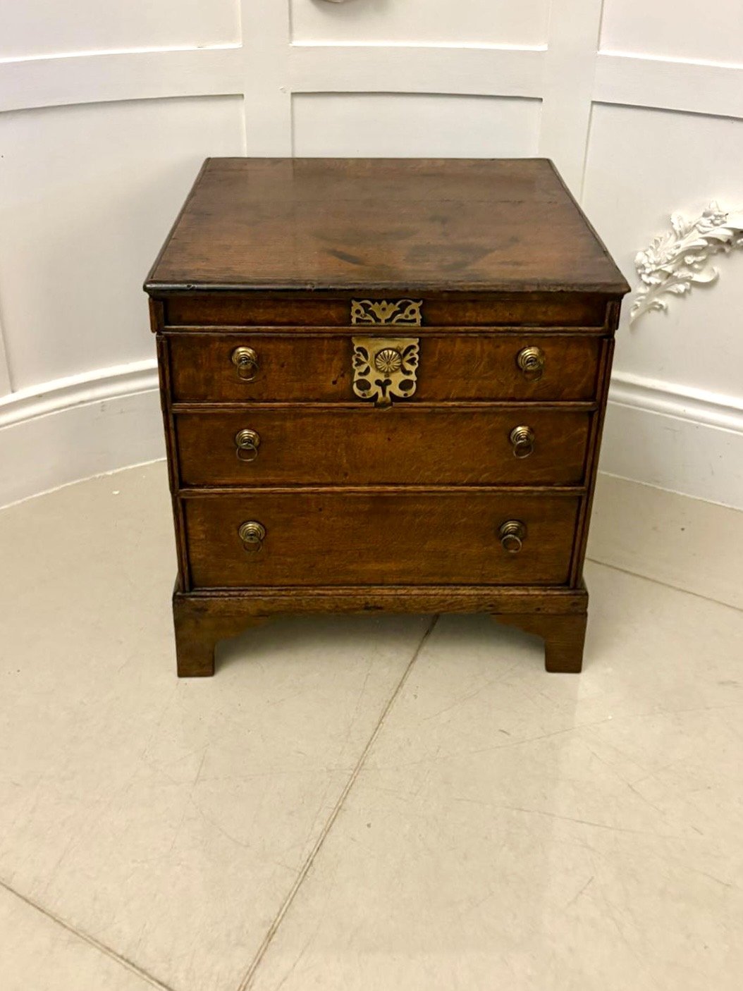 A charming early Queen Anne period oak box coffer dating from circa 1710 constructed in the form of a small three-drawer chest. This compact coffer opens from the top, the hinged lid lifting to reveal a deep lead-lined interior.