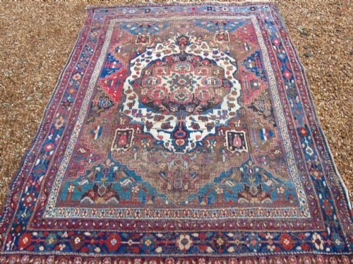 This is an attractive handwoven antique carpet with a nice country house look dating from around 1890. The carpet has a most appealing colour palette and just the right amount of wear to it. The typical Afshar design has a large ivory central medallion enclosed by colourful geometric motifs in teal blue, royal blue and raspberry, and enclosed by pretty multiple borders. The carpet has overall wear which has subtly softened the colour palette over time