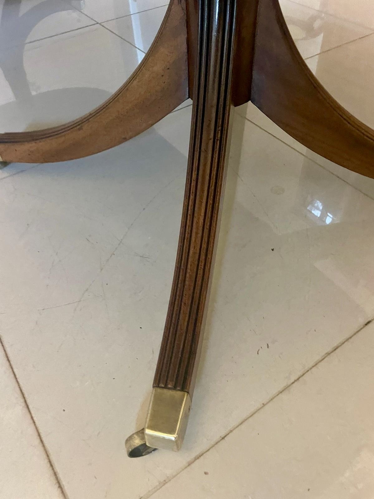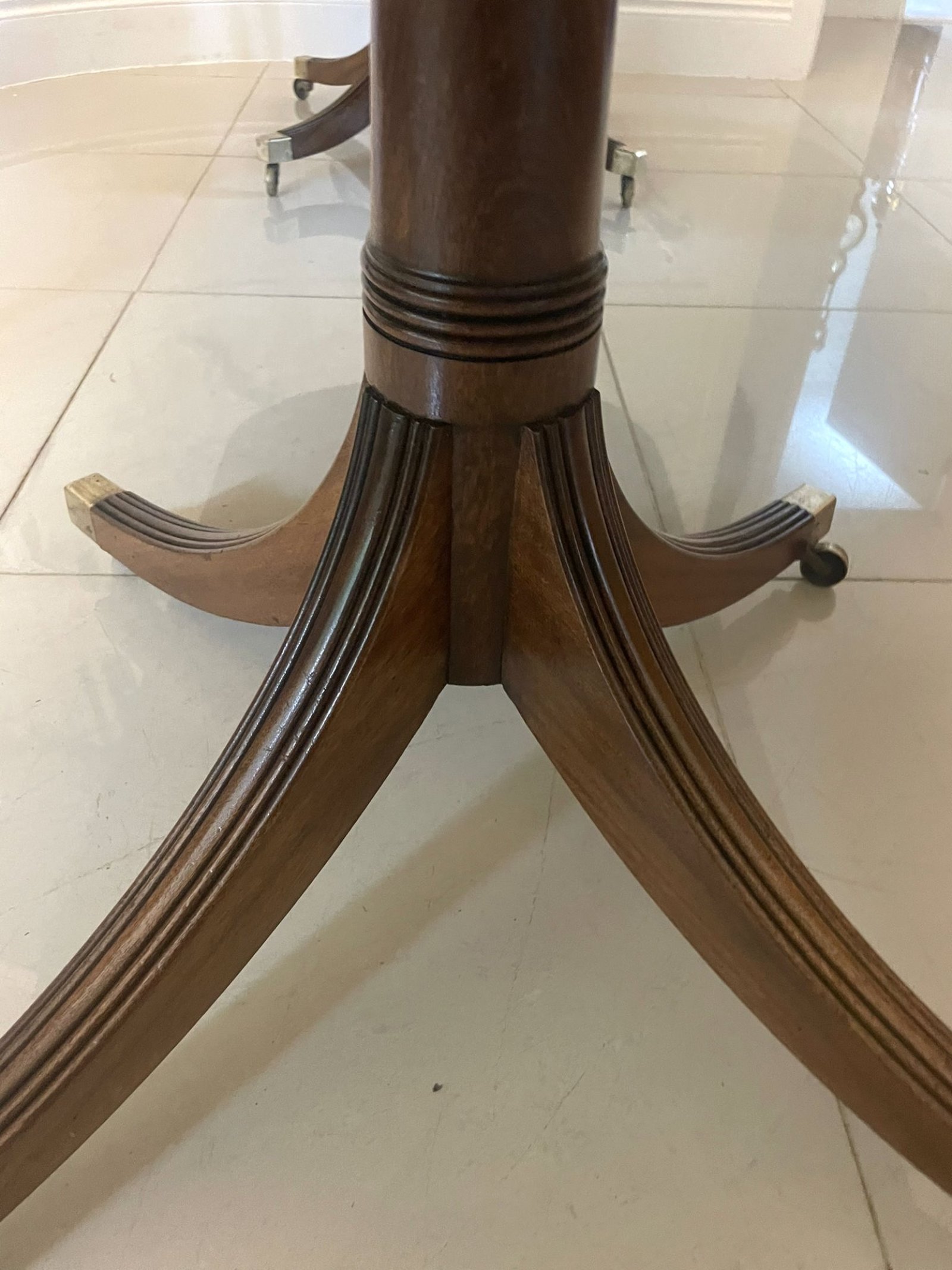 Antique Edwardian 10 seater quality figured mahogany two pilar dining table having a quality figured mahogany top with a moulded edge 2 original leaves supported by 2 pedestal columns standing on 4 reeded sabra legs with original brass castors and brass clips