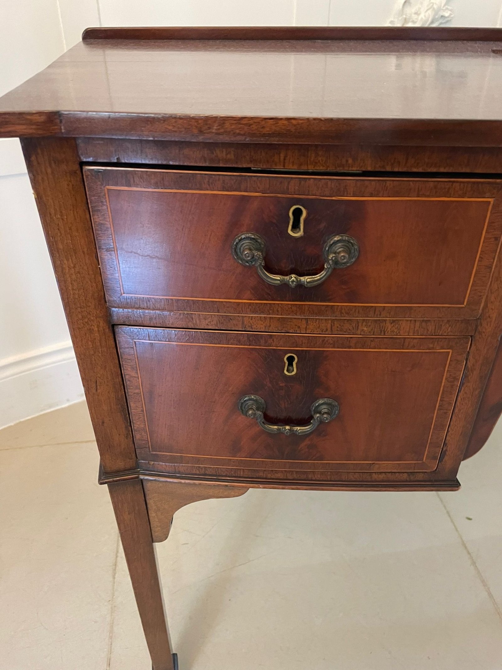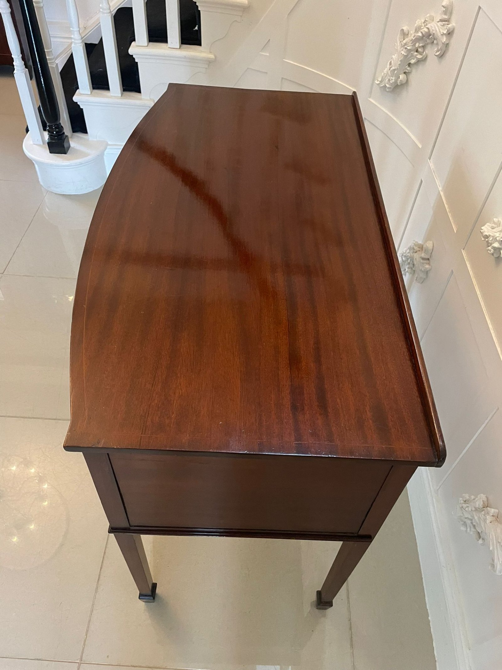Antique Edwardian mahogany bow front inlaid sideboard having a lovely mahogany top, five attractive inlaid drawers with original brass handles standing on four inlaid elegant square tapering legs with spade feet.