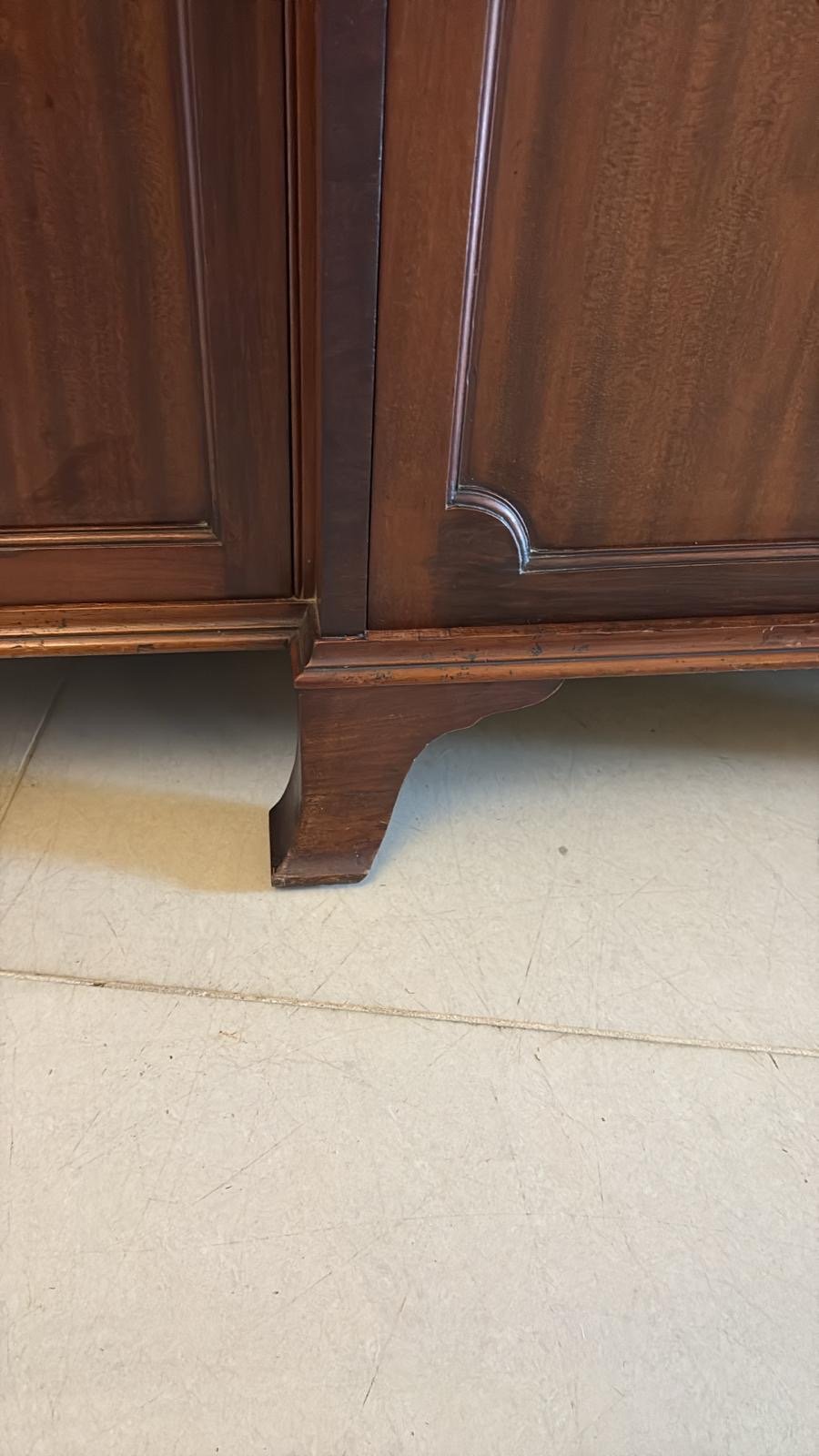 The mahogany has a rich warm tone with pleasing figuring across the doors and a lovely mellow appearance. Raised on shaped bracket feet and finished with a decorative moulded frieze, this is an attractive and practical antique cabinet with plenty of storage.