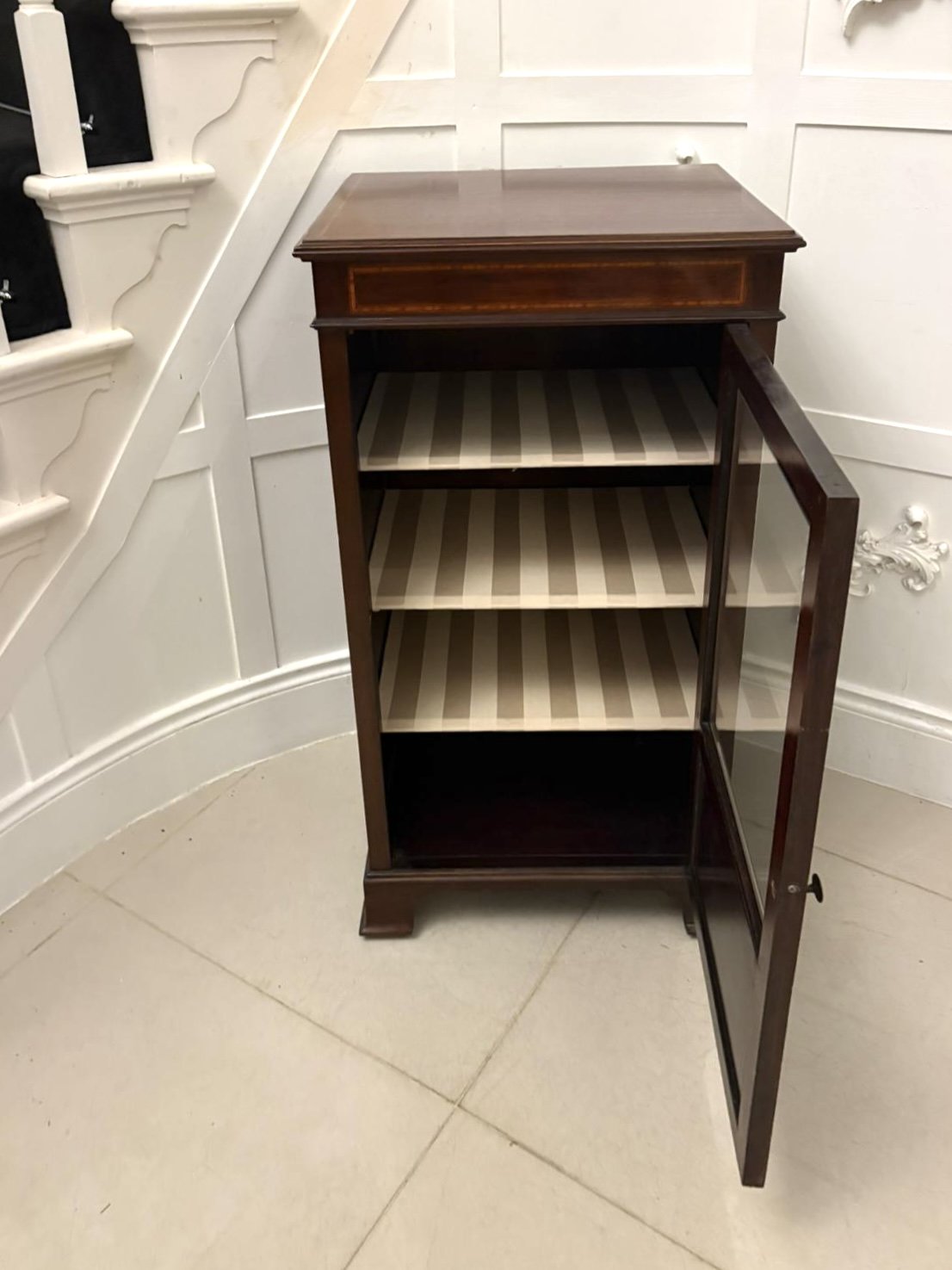 The glazed door opens to reveal three adjustable shelves neatly lined in a contemporary striped fabric offering the perfect showcase for porcelain, glassware, or treasured decorative pieces. The cabinet stands on bracket feet, raised on its original porcelain castors for ease of movement and a touch of luxury. It is finished in a rich, warm patina, this piece embodies the grace and refinement of the Edwardian era.