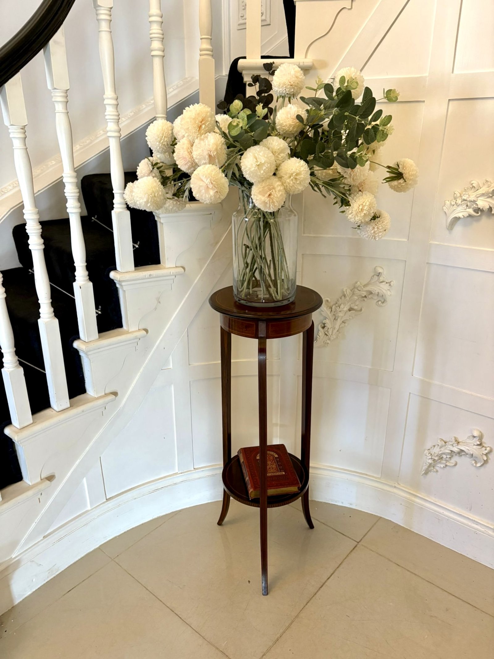A round undertier provides additional stability and display space, also finished with matching satinwood inlay. The warm mahogany tones paired with the crisp satinwood detailing make this a versatile and highly decorative stand, ideal for plants, vases, sculptures or decorative accents throughout the home.