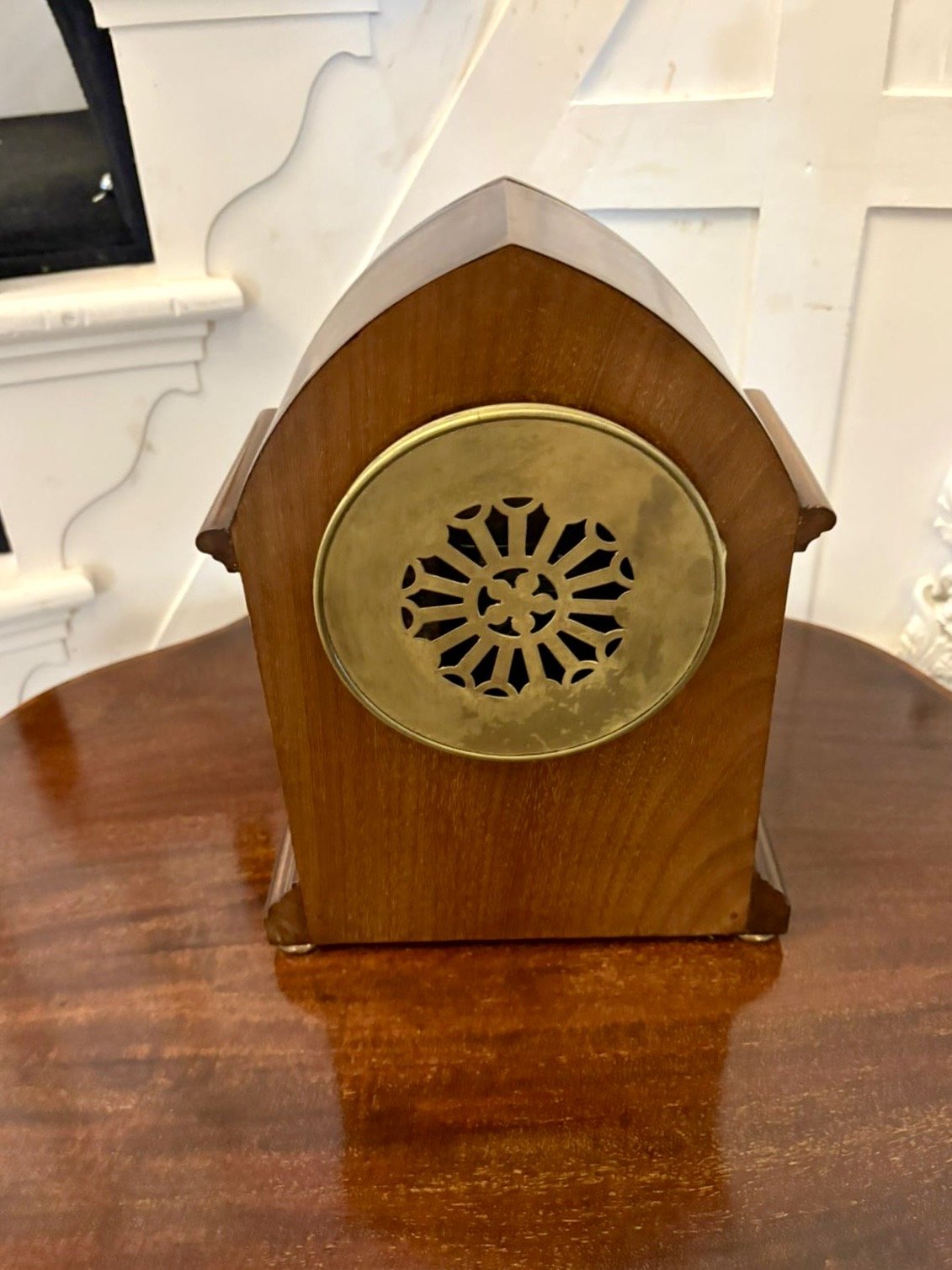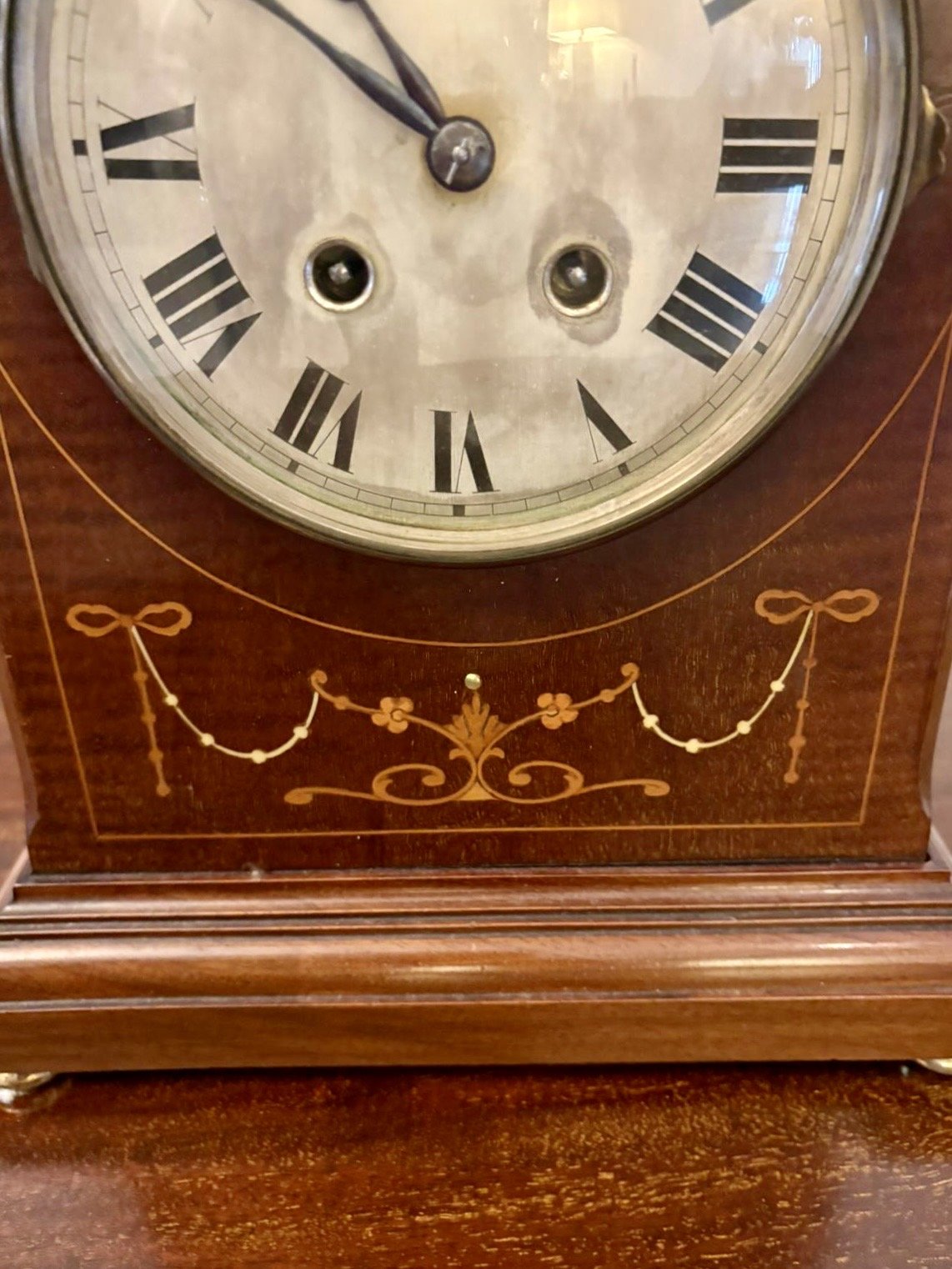 A refined and beautifully proportioned Edwardian mahogany mantel clock of elegant Gothic-arched form decorated with delicate satinwood inlay depicting bows, floral garlands and classical scrollwork. The rich mahogany case rests on small gilt brass feet giving the piece a subtle lift and refined presence.