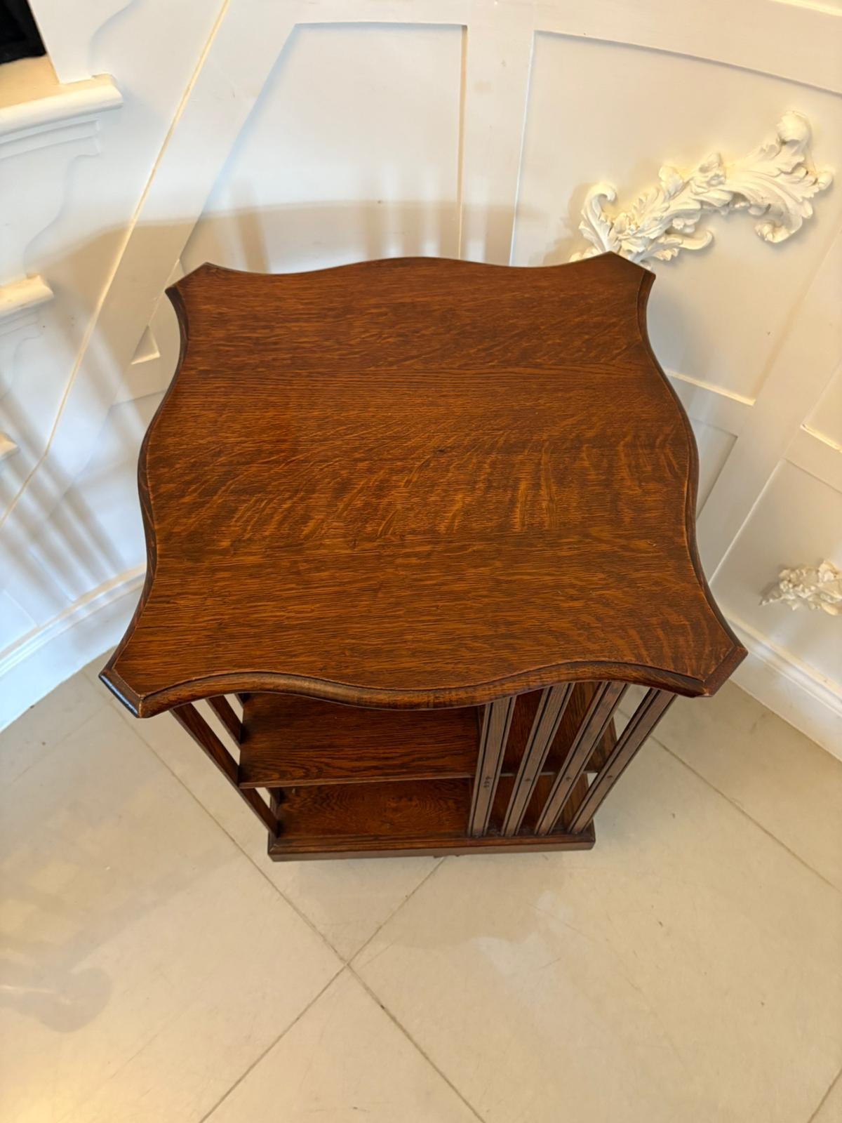 Antique Edwardian Oak revolving bookcase having a quality mahogany serpentine shaped top with a moulded edge supported by mahogany reeded splats. It boasts eight open book shelves supported by a plinth base raised on a revolving mahogany cross stretcher with original castors.