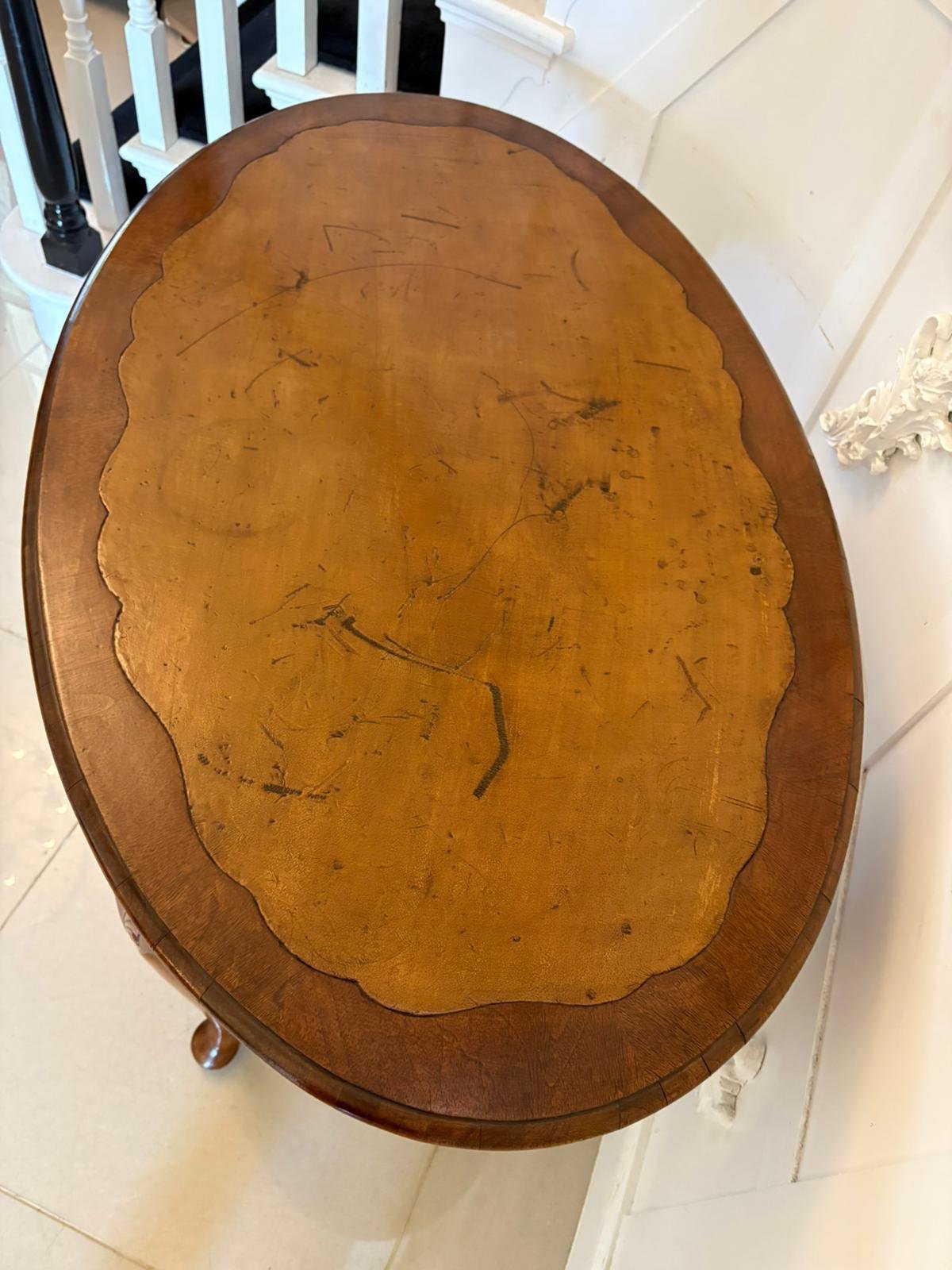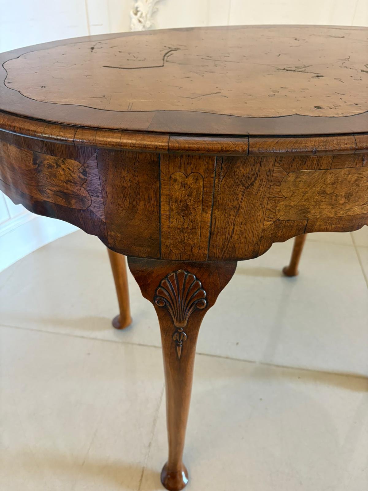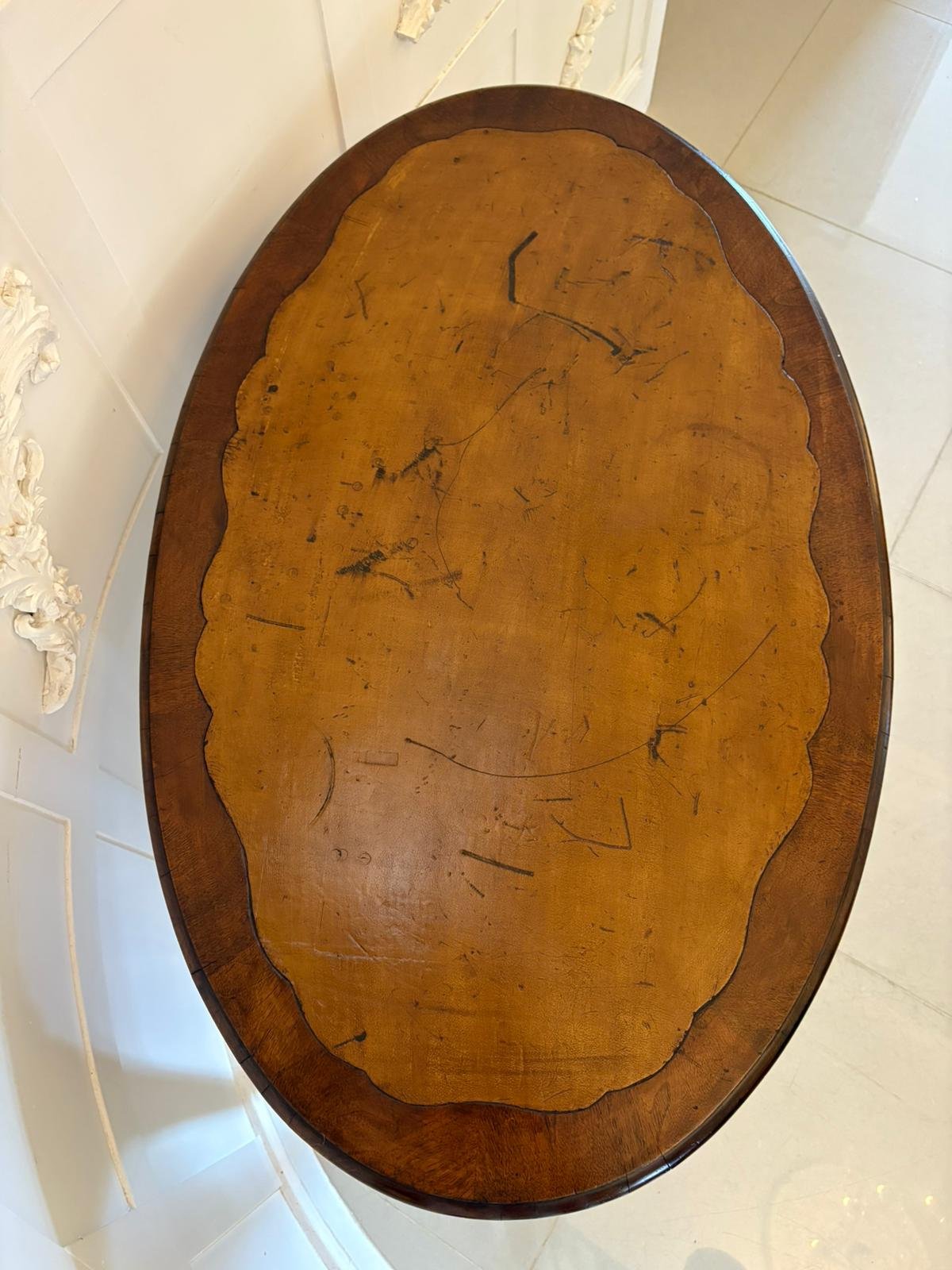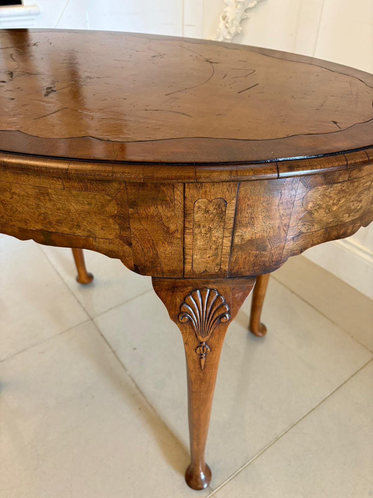 Antique Edwardian Quality Burr Walnut Freestanding Oval Shaped Writing Table