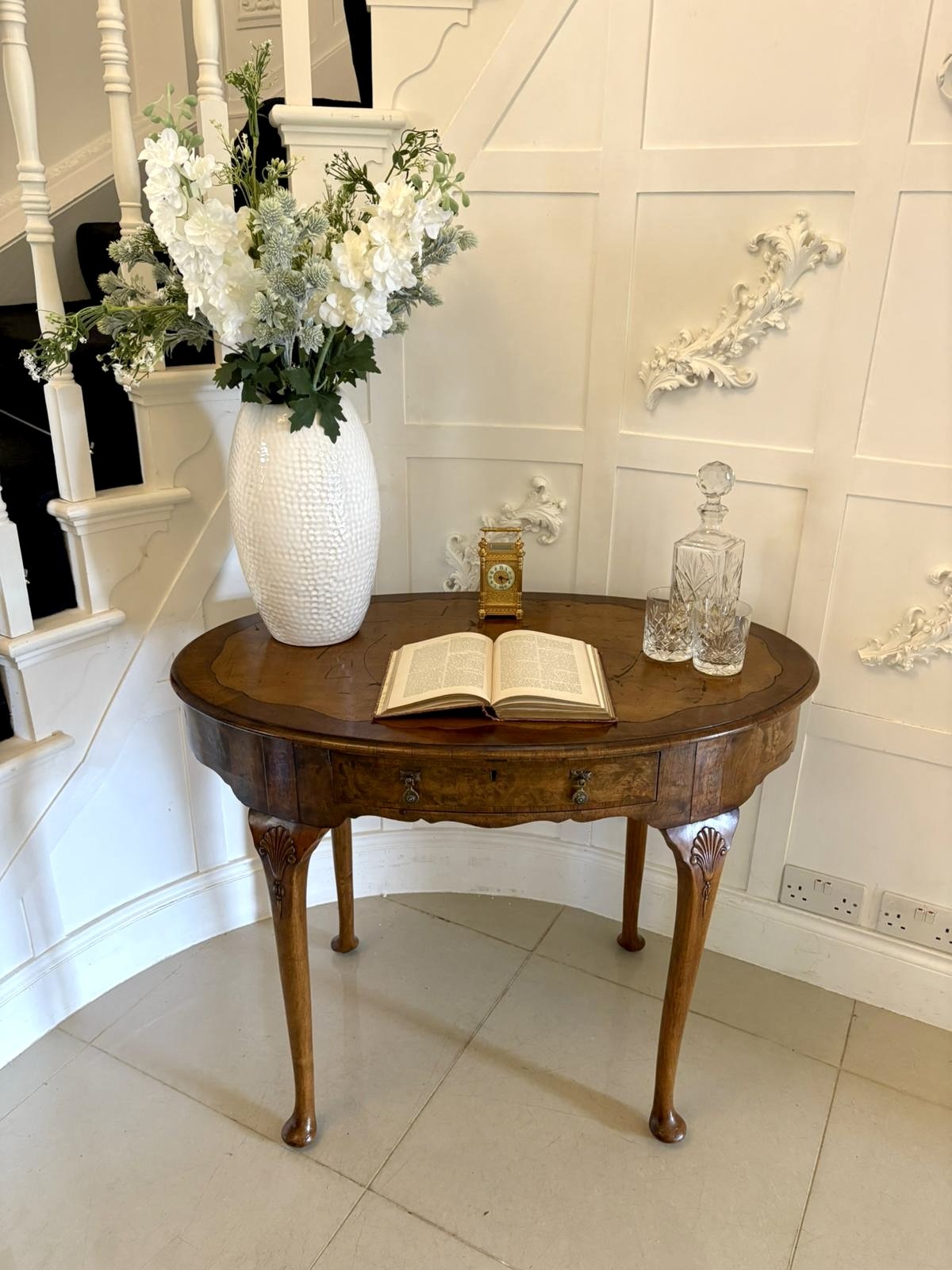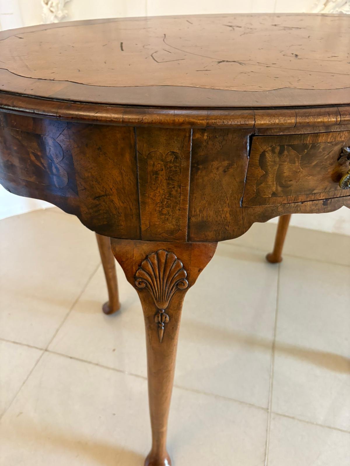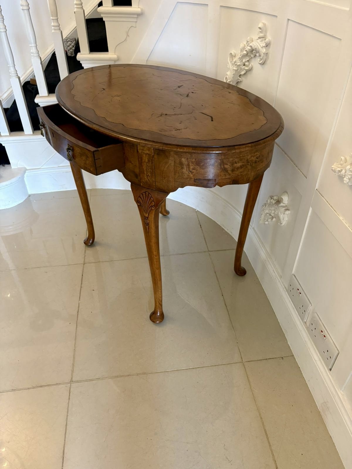Antique Edwardian quality burr walnut freestanding oval shaped writing table having an oval shaped burr walnut top with a moulded edge and a shaped leather writing surface, one long burr walnut drawer with original brass handles standing on shaped carved walnut cabriole legs with pad feet.