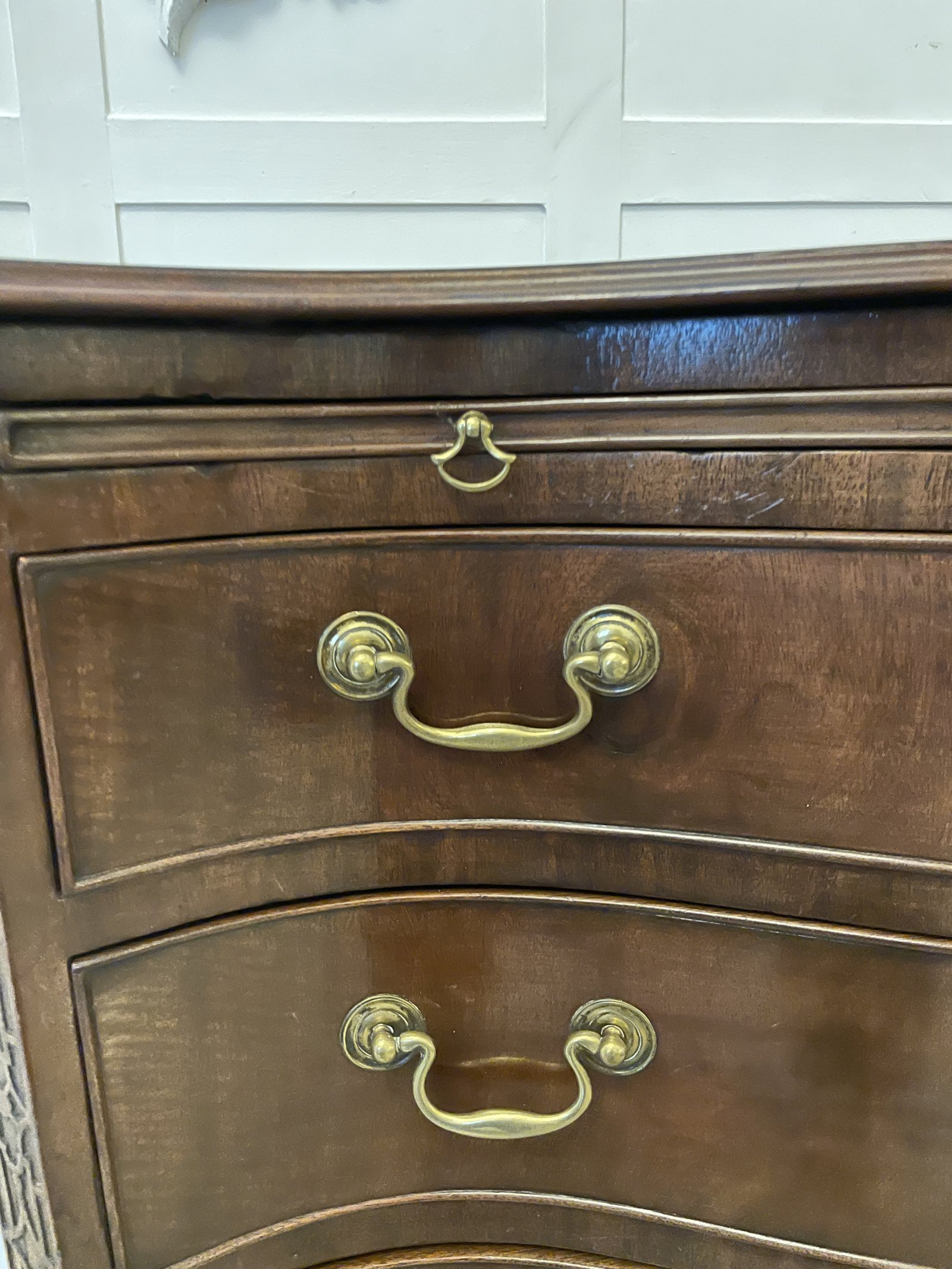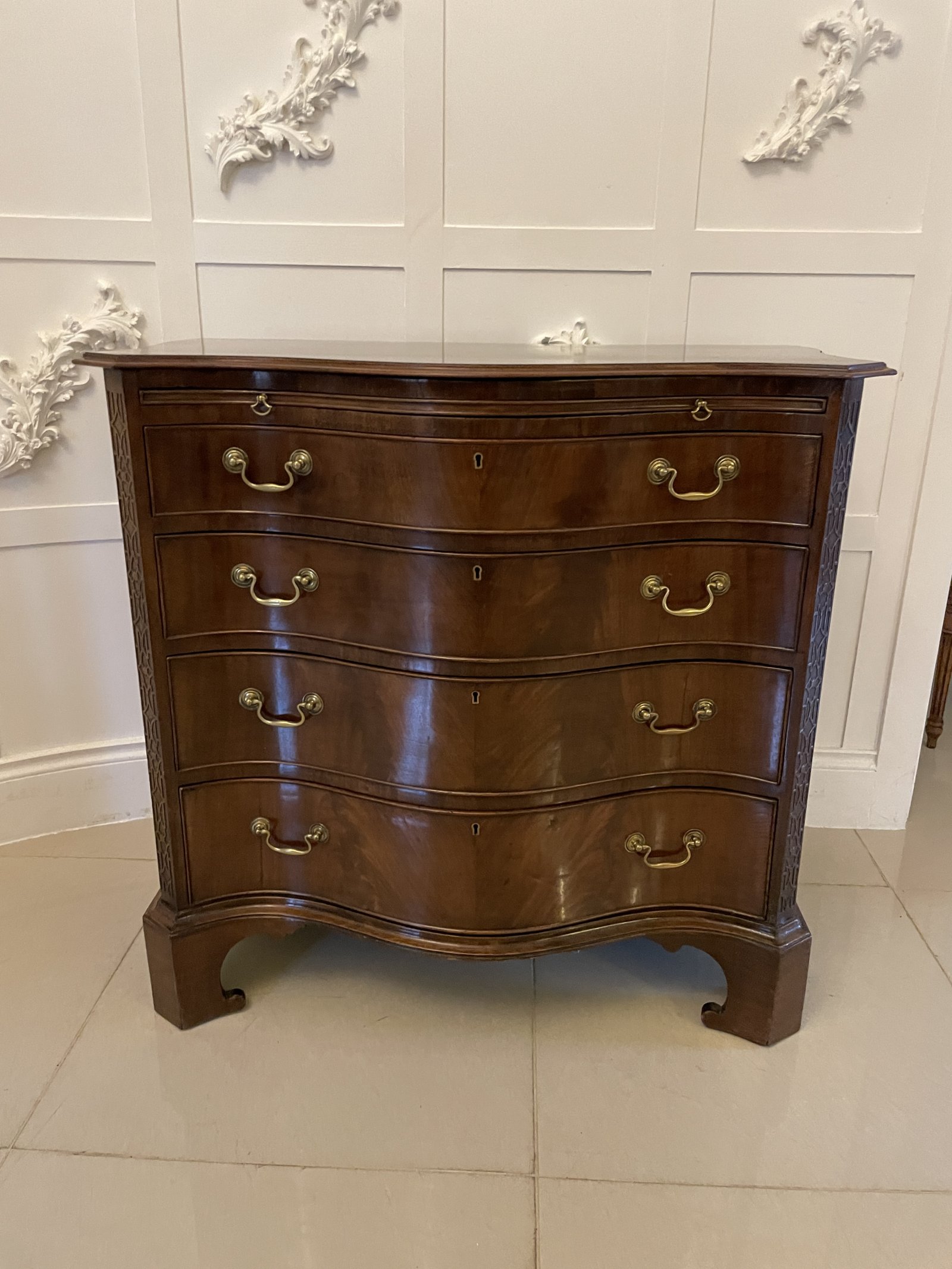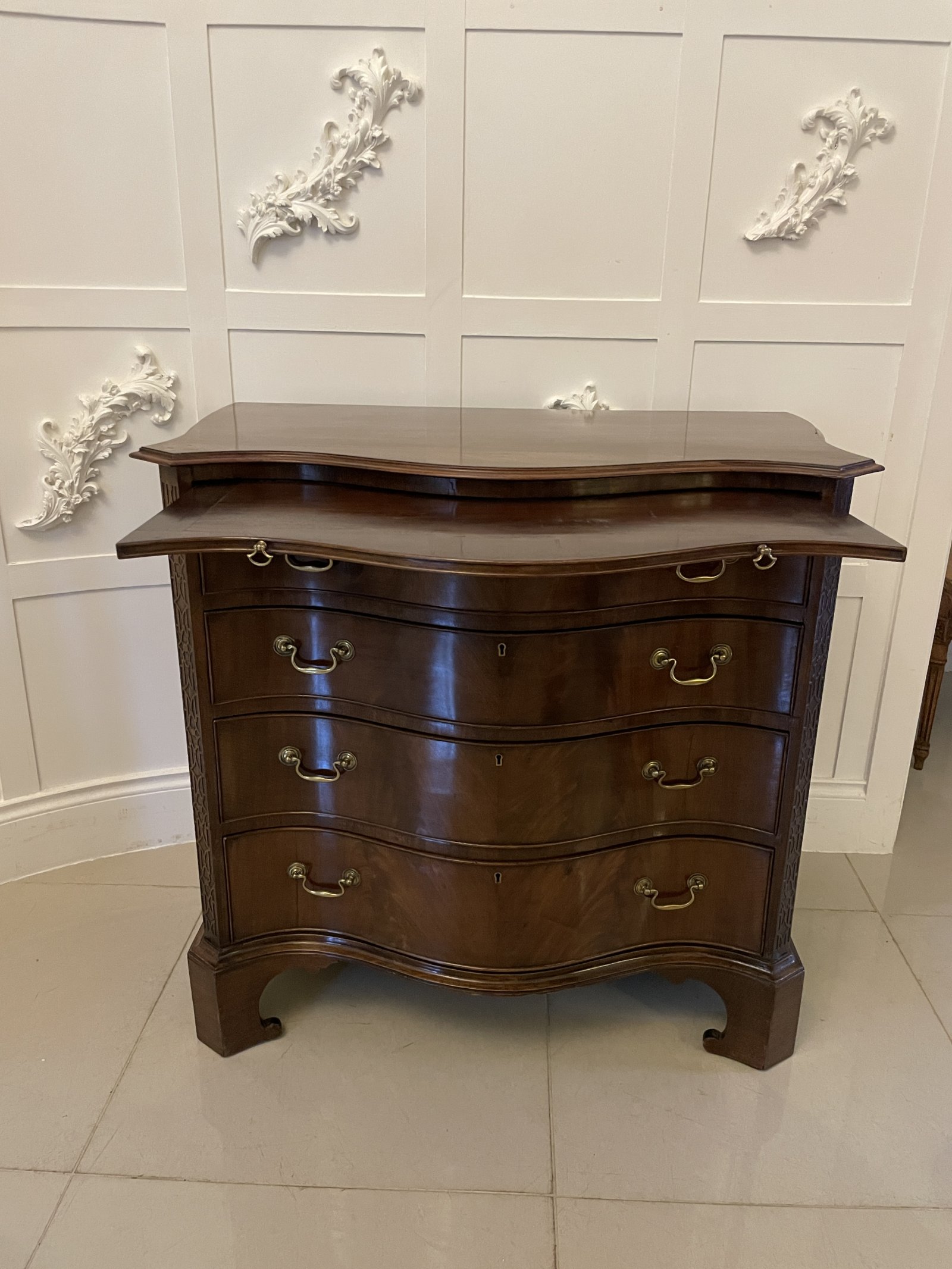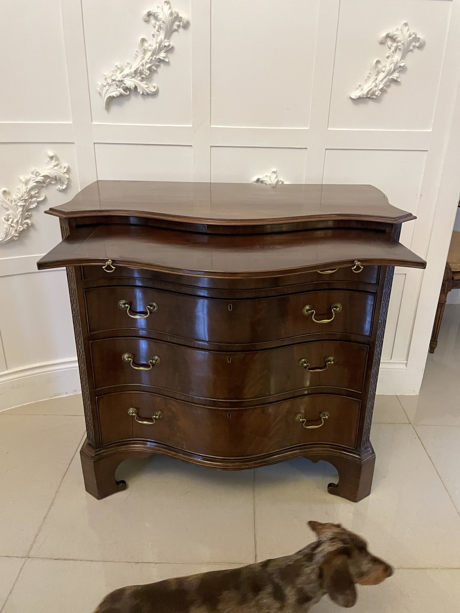 Antique Edwardian quality figured mahogany serpentine chest of drawers with a brushing slide