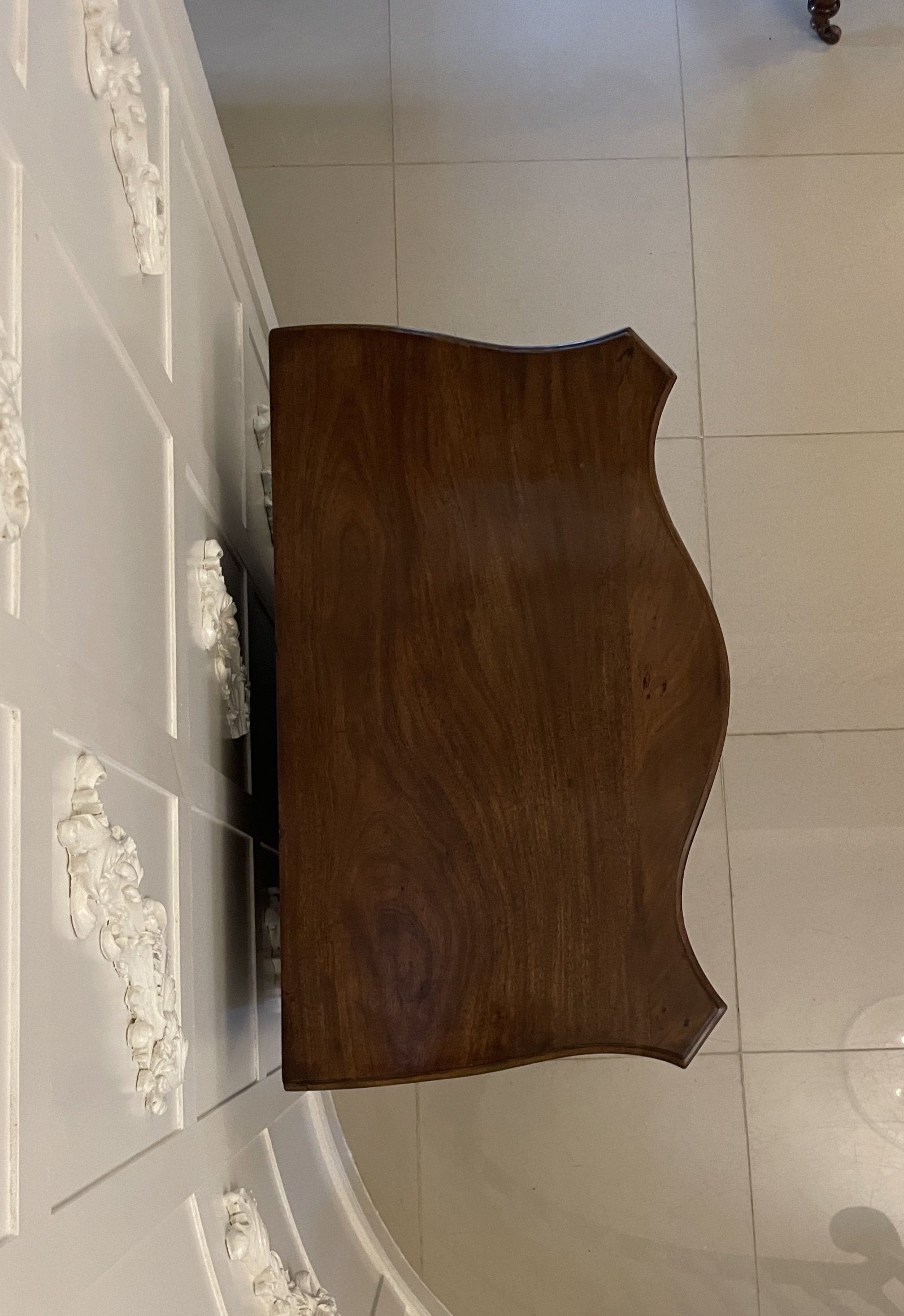 having a quality figured mahogany serpentine shape top with a moulded edge above a brushing slide, four long cockbeeded oak lined drawers with original brass swan neck handles, pretty carved canted corners standing on original bracket feet