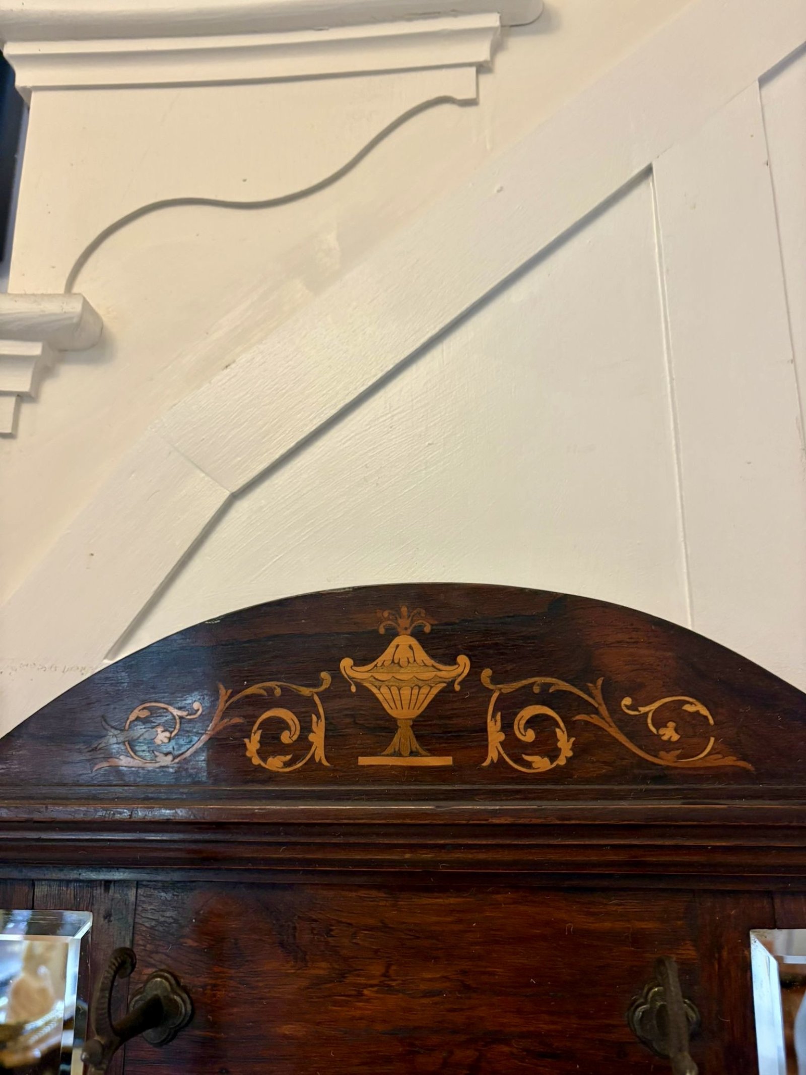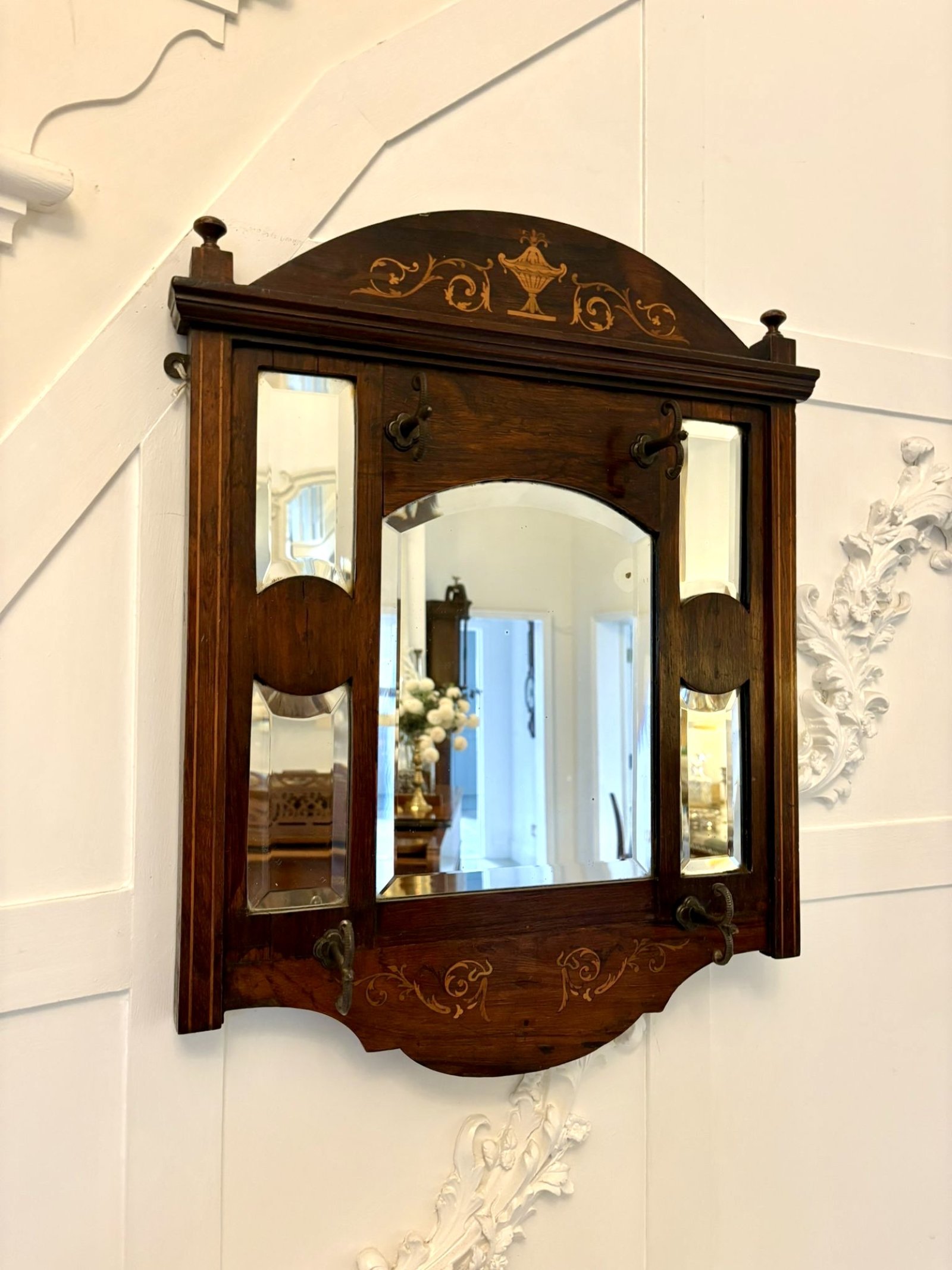 Antique Edwardian quality inlaid rosewood wall/hall mirror having 5 bevelled edge mirrors in a quality inlaid rosewood frame with 4 original irons hooks for hats.