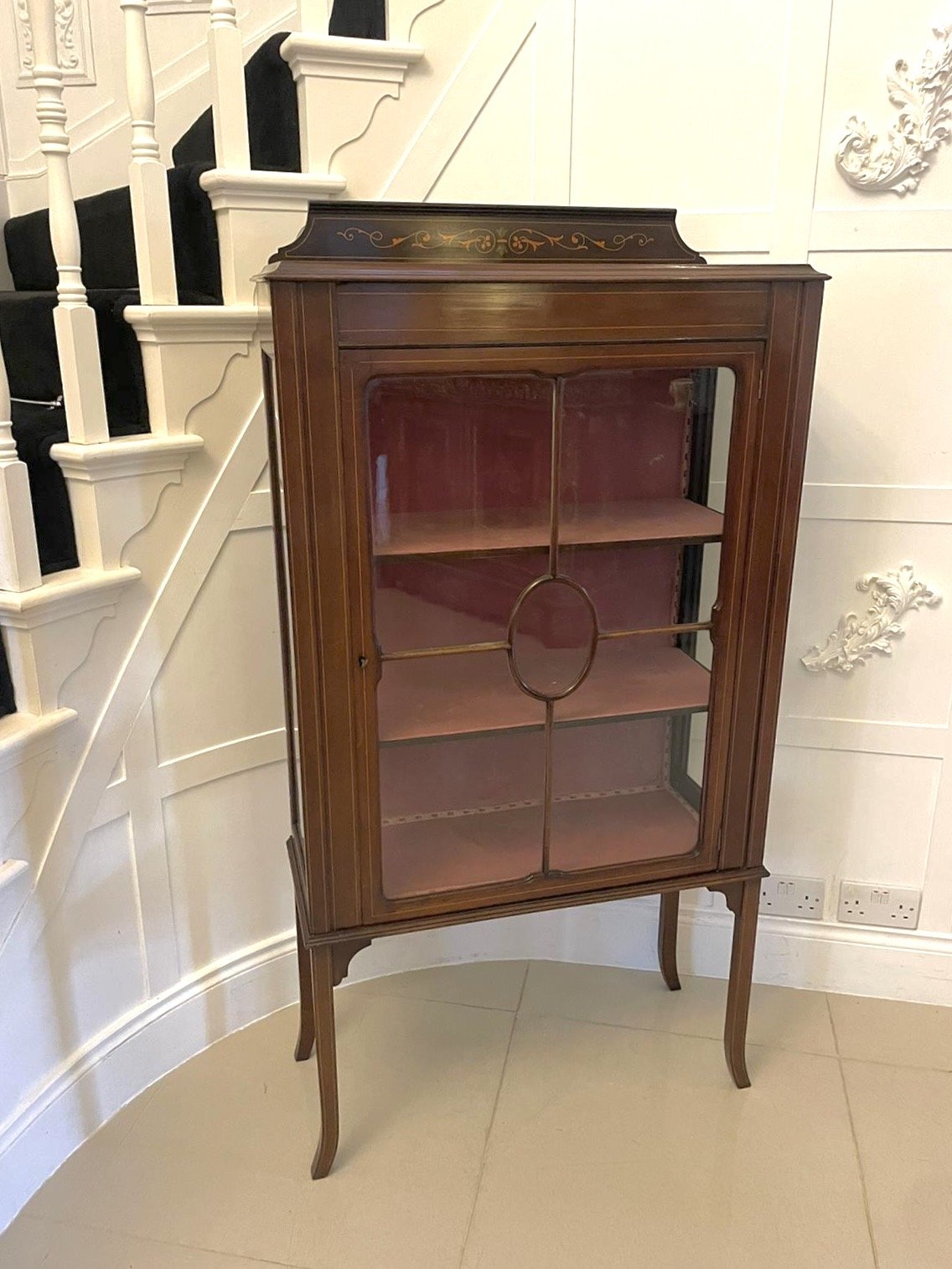 Antique Edwardian quality mahogany inlaid display cabinet having a shaped gallery back with original painted decoration above an inlaid mahogany frieze and a single astral glazed mahogany inlaid door opening to reveal 2 display shelves, glazed sides standing on inlaid mahogany splayed legs