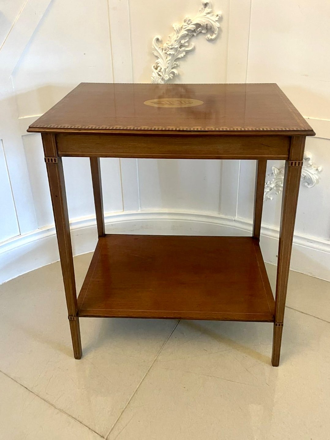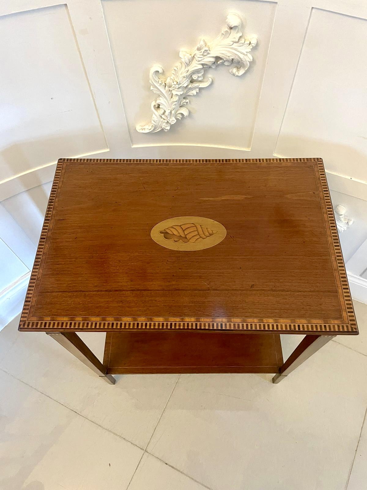 Antique Edwardian quality mahogany inlaid lamp table Having a quality mahogany rectangular shaped top crossbanded in satinwood with a oval inlaid shell to the centre mahogany frieze with satinwood inlaid stringing standing on elegant square tapering legs united by a mahogany inlaid undertier