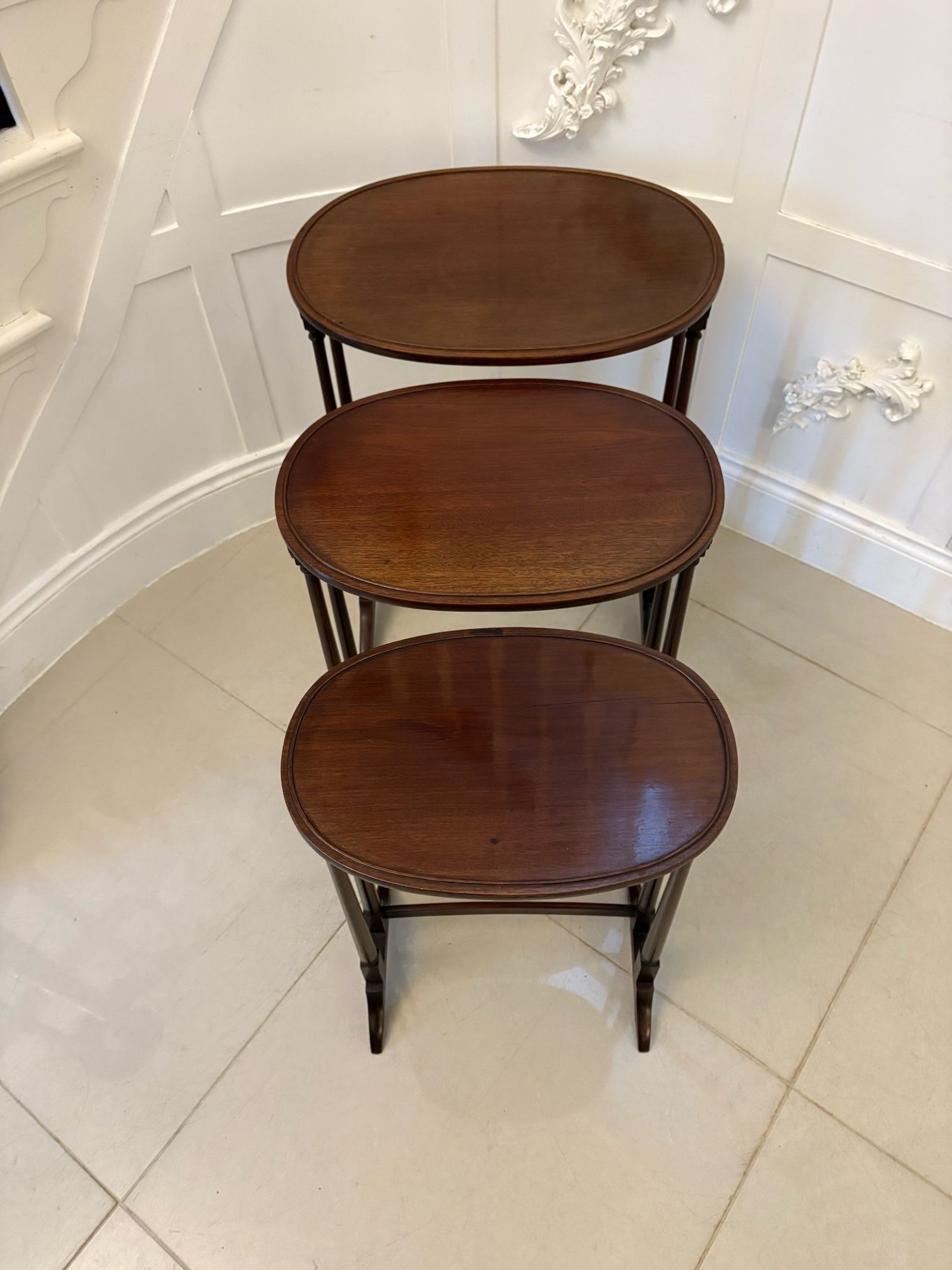 Antique Edwardian quality mahogany nest of 3 tables having quality mahogany oval tops with a beaded edge supported by turned tapering columns standing on shaped feet united by a mahogany stretcher