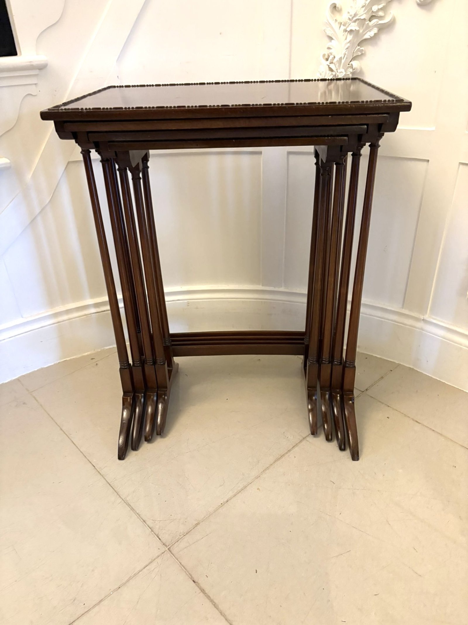 Antique Edwardian quality mahogany nest of four tables having quality mahogany rectangular shaped tops with a beaded edge supported by elegant turned mahogany columns standing on shaped legs united by shaped structures