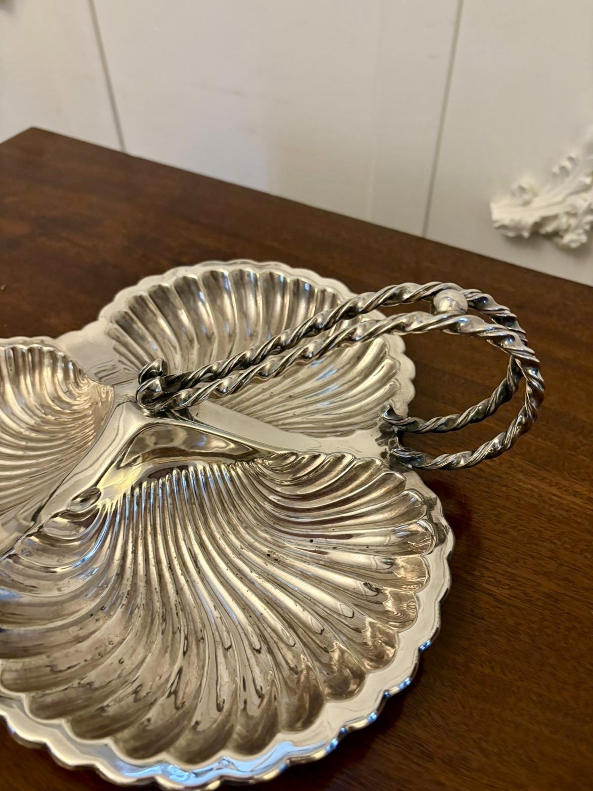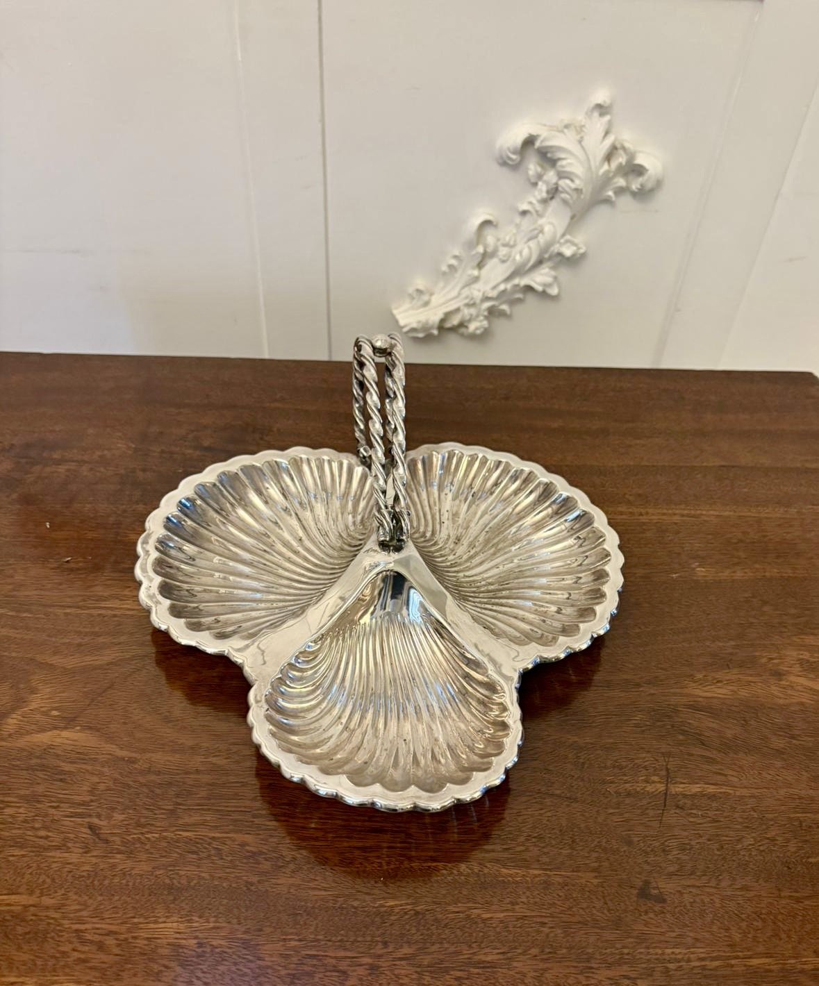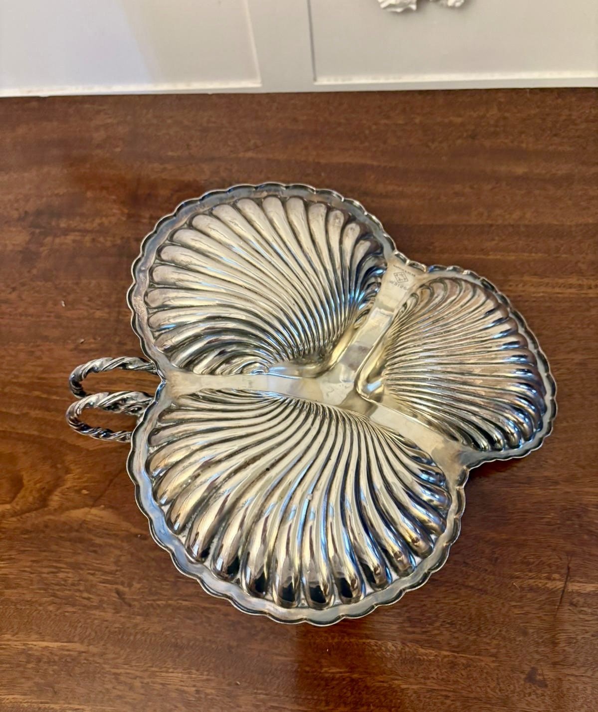 Antique Edwardian quality silver plated serving dish by Mappin & Webb having three shaped shells with an ornate rope twist handle marked Mappin and Webb