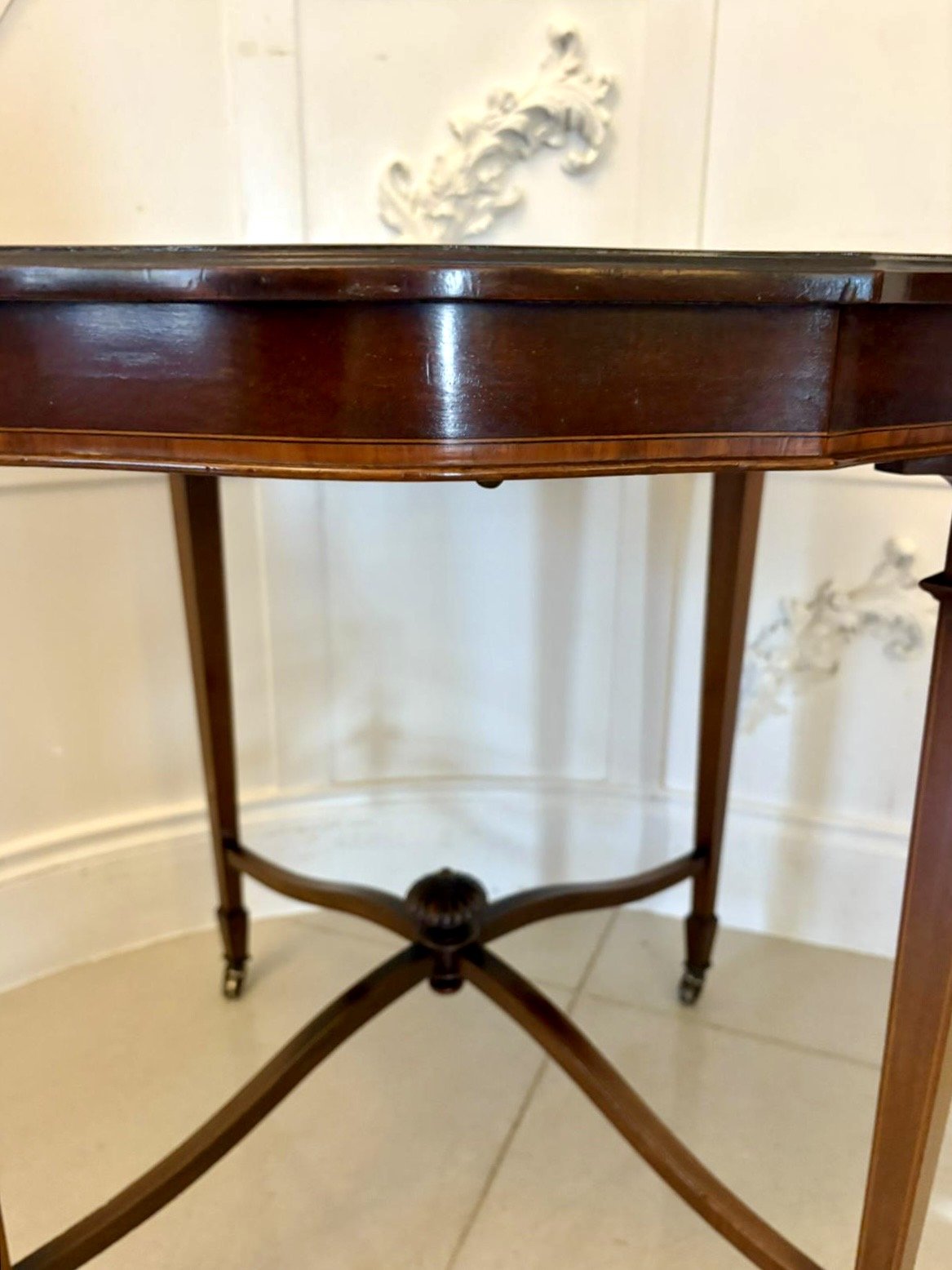 A refined Edwardian lamp or centre table of elegant form. The shaped top is beautifully figured and outlined with fine satinwood stringing, giving the table a sophisticated and decorative appearance characteristic of the late Victorian–Edwardian transitional style.