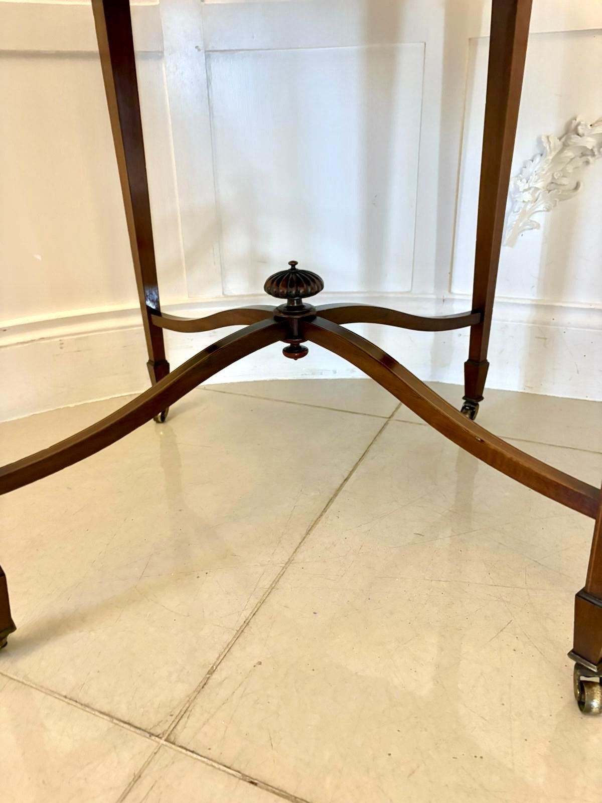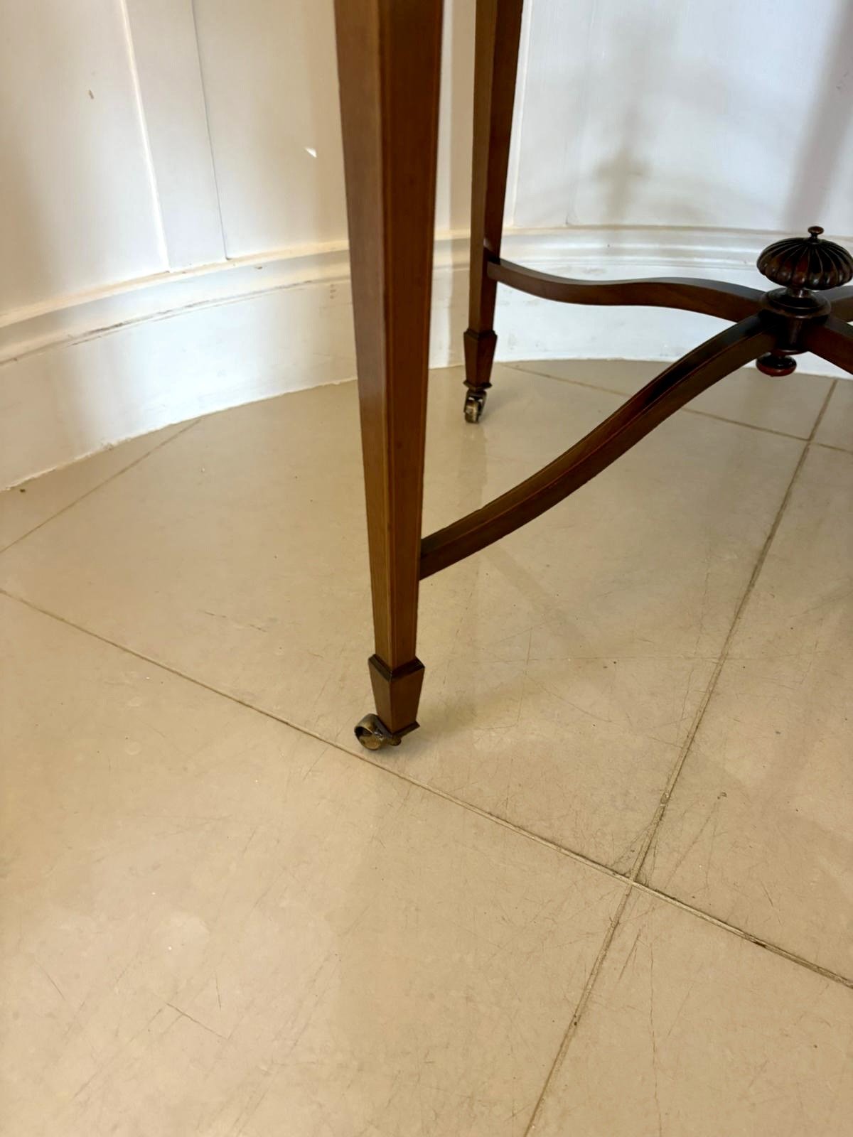 The table stands on four square tapering legs terminating in spade feet all united by delicate cross stretchers with a turned finial to the centre—an attractive and well-balanced feature. The original castors remain in place allowing the piece to move easily when required.
