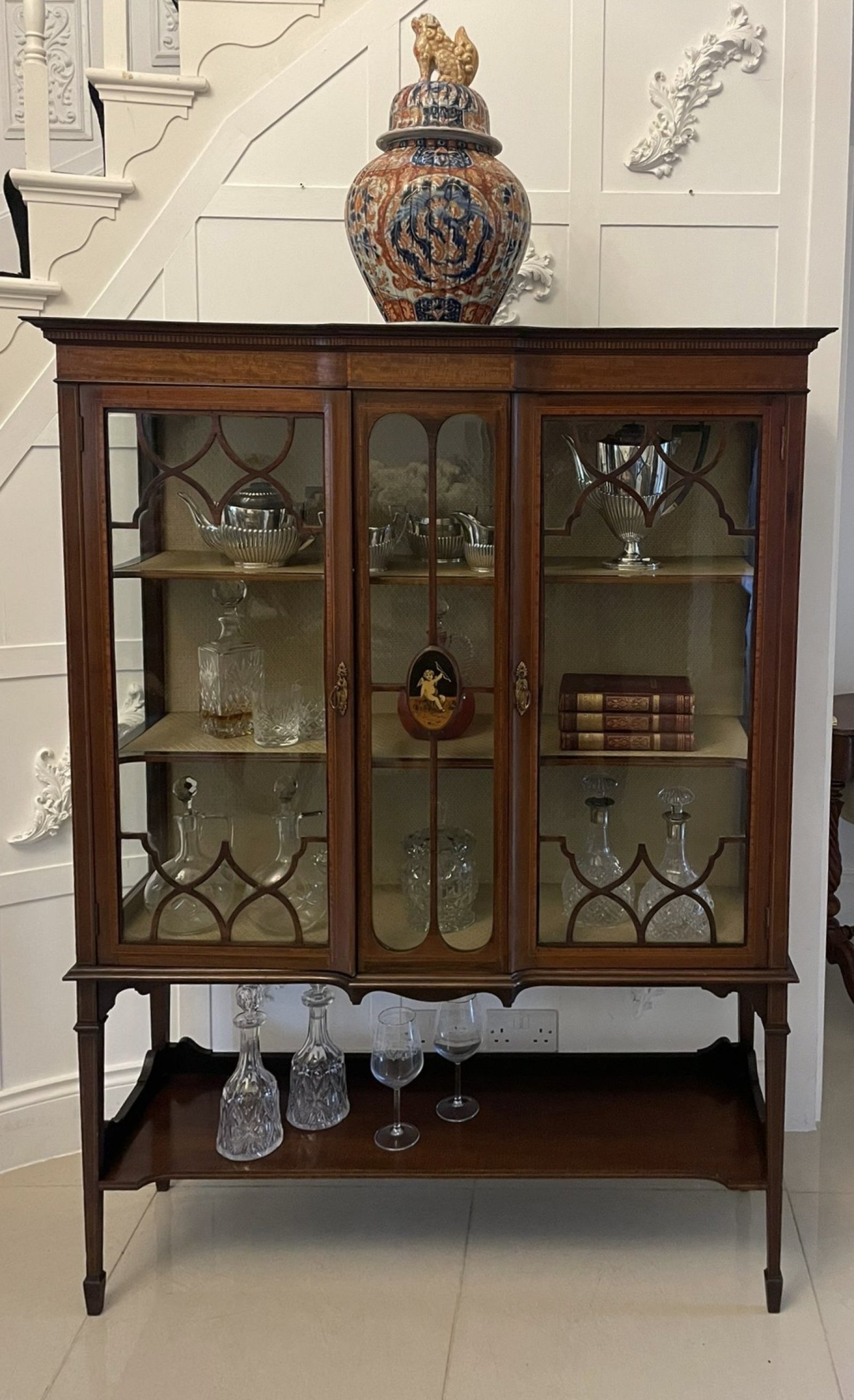 Antique Edwardian superb quality inlaid mahogany display cabinet having a figured mahogany frieze inlaid with satinwood above an astral glazed centre panel with an oval inlaid plaque flanked by a pair of astral glazed doors with original gilded ornate handles opening to reveal two adjustable display shelves, glazed sides standing on square tapering inlaid mahogany legs with spade feet united by a shaped mahogany undertier