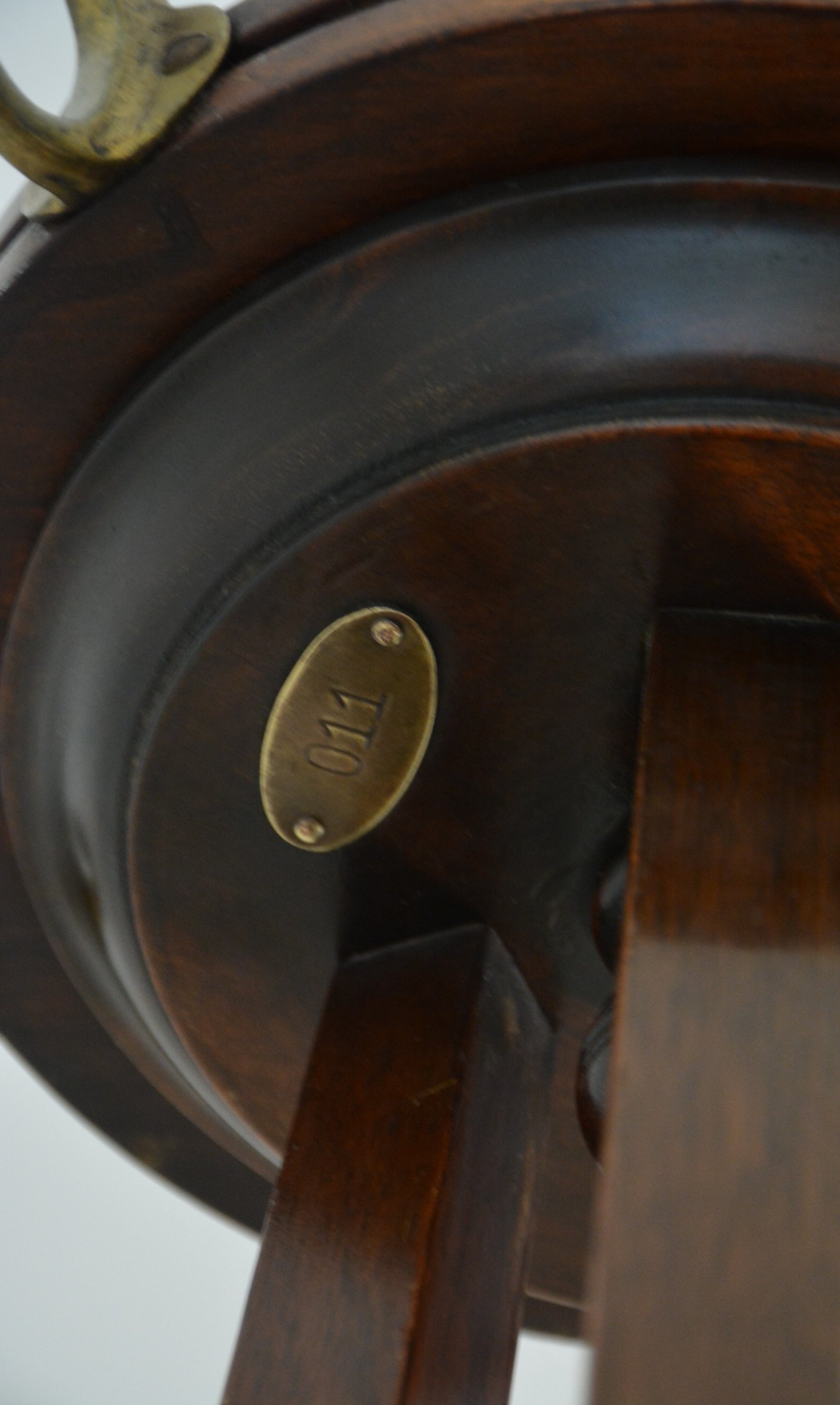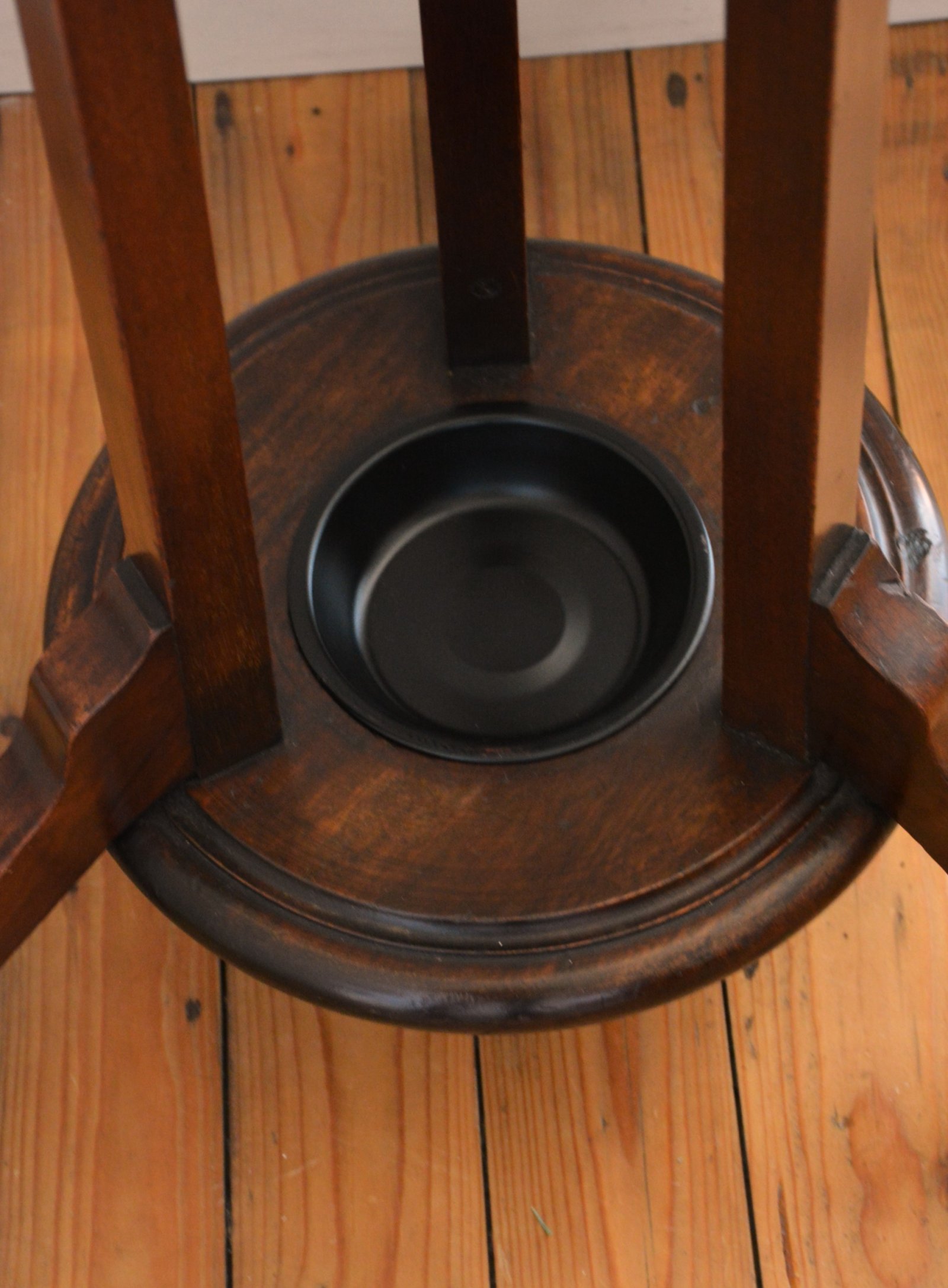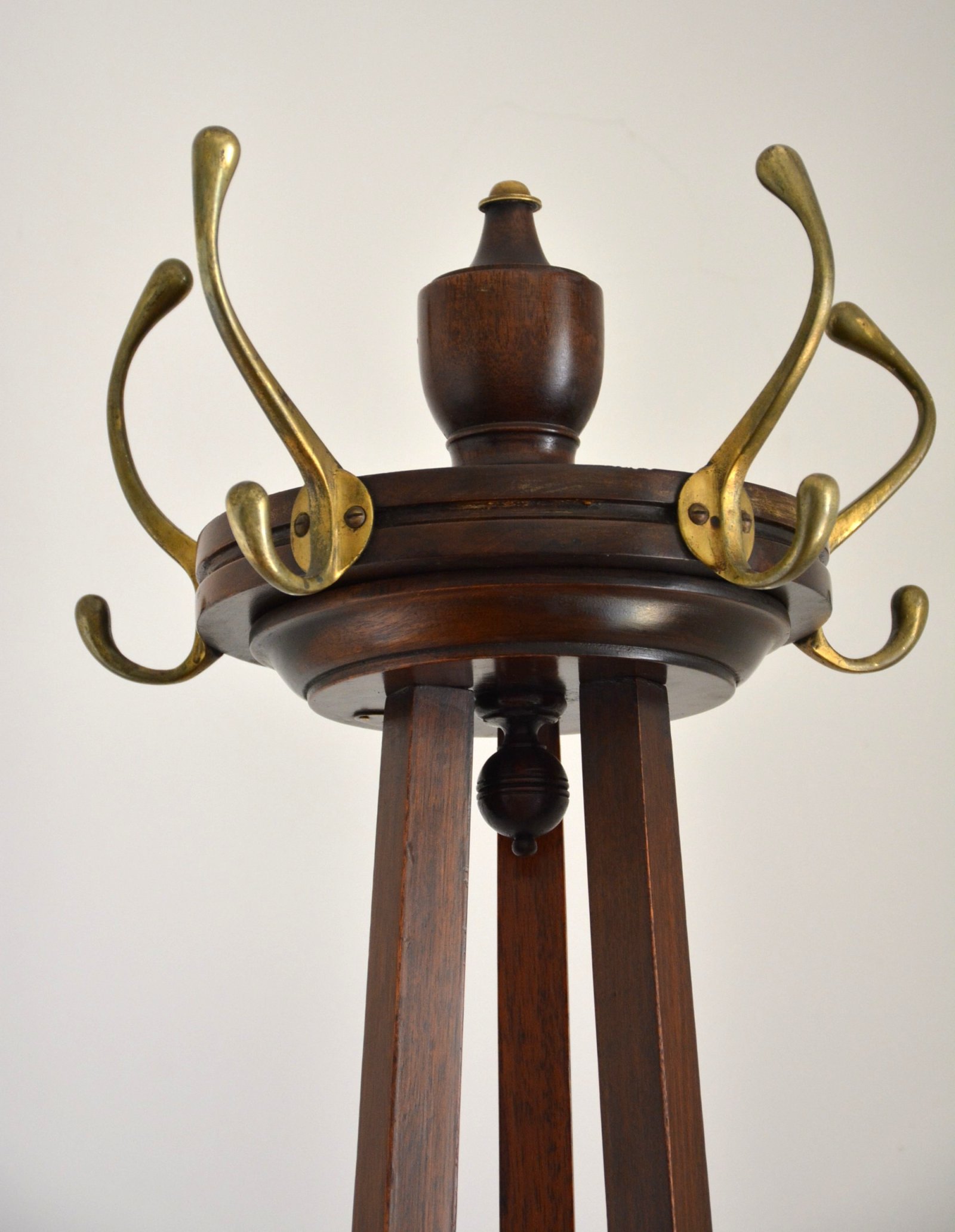 P0333 Antique English Arts and Crafts coat stand in solid mahogany, having circular revolving platform fitted with five original brass coat and hat hooks decorated with a turned finial above and below on three supports with three coat hooks and a finial, all united by a shaped umbrella holders. The three uprights terminate in a moulded circular base enclosing a removable drip tray, and three downswept and shaped legs. This antique coat rack retains its original deep colour, soft patina and antique character. No breaks to uprights or legs, no woodworm, solid and sturdy. This antique hall stand is in home ready condition. c1890 Revolving top can be removed for transportation H184cm.