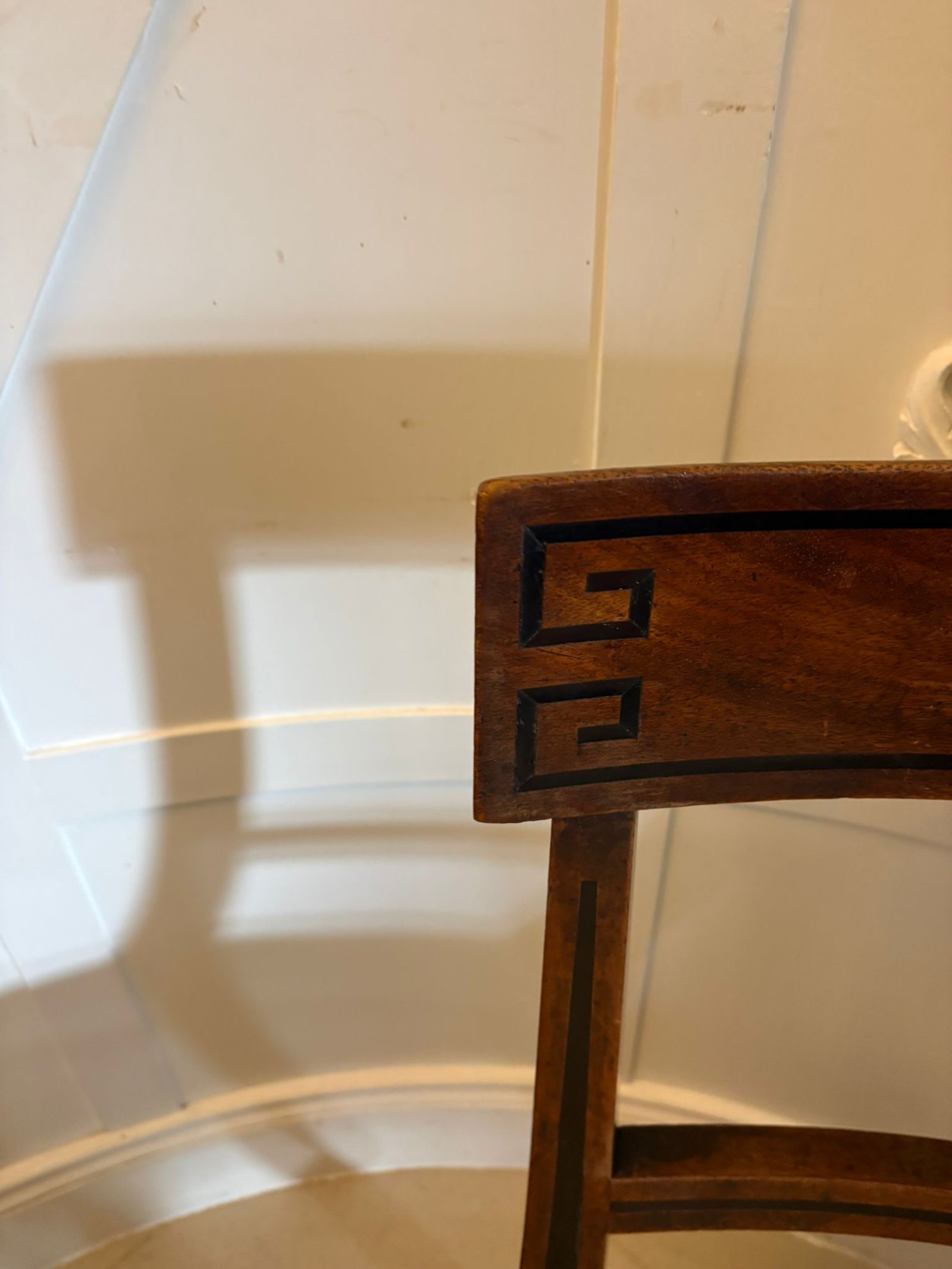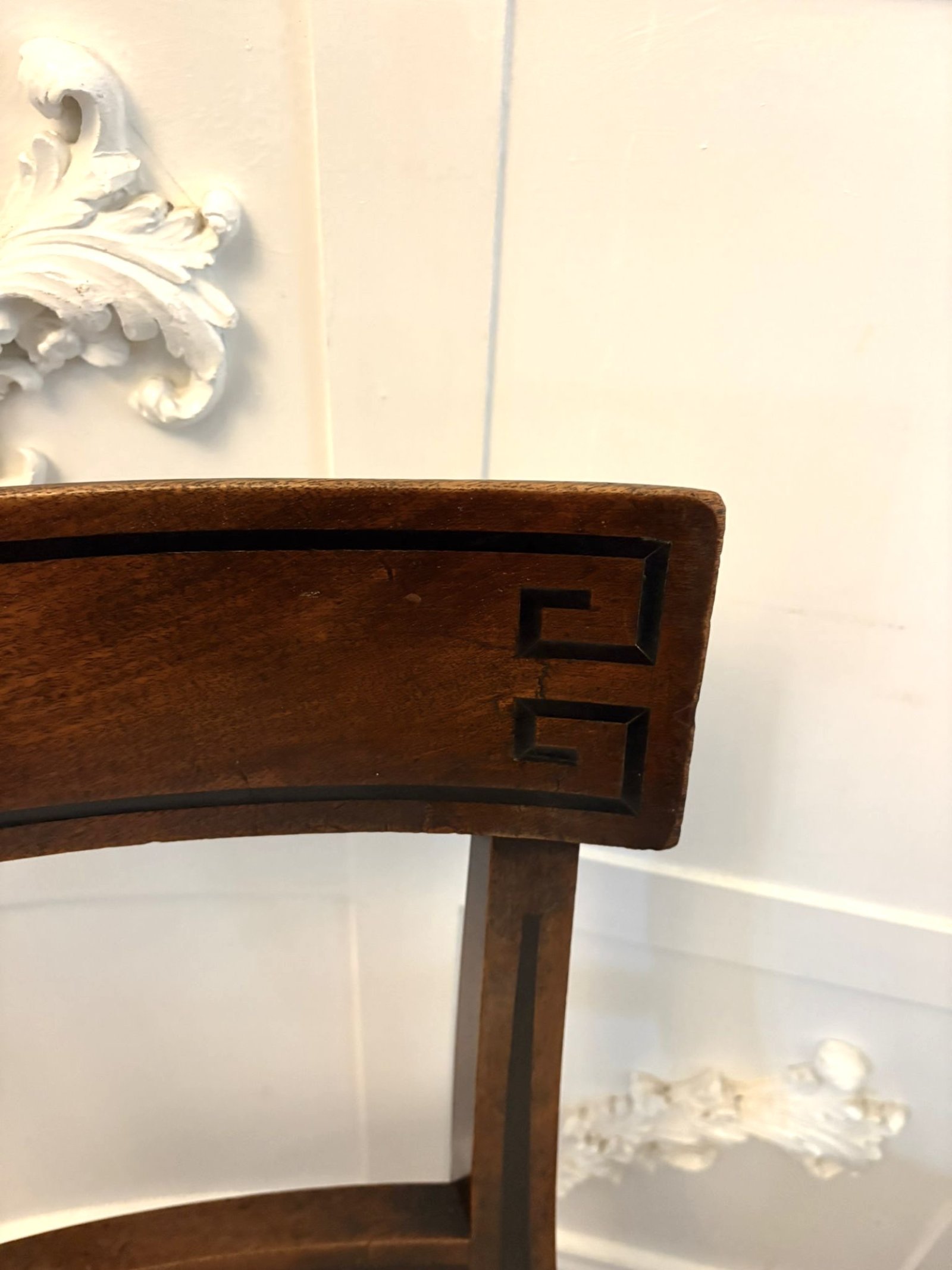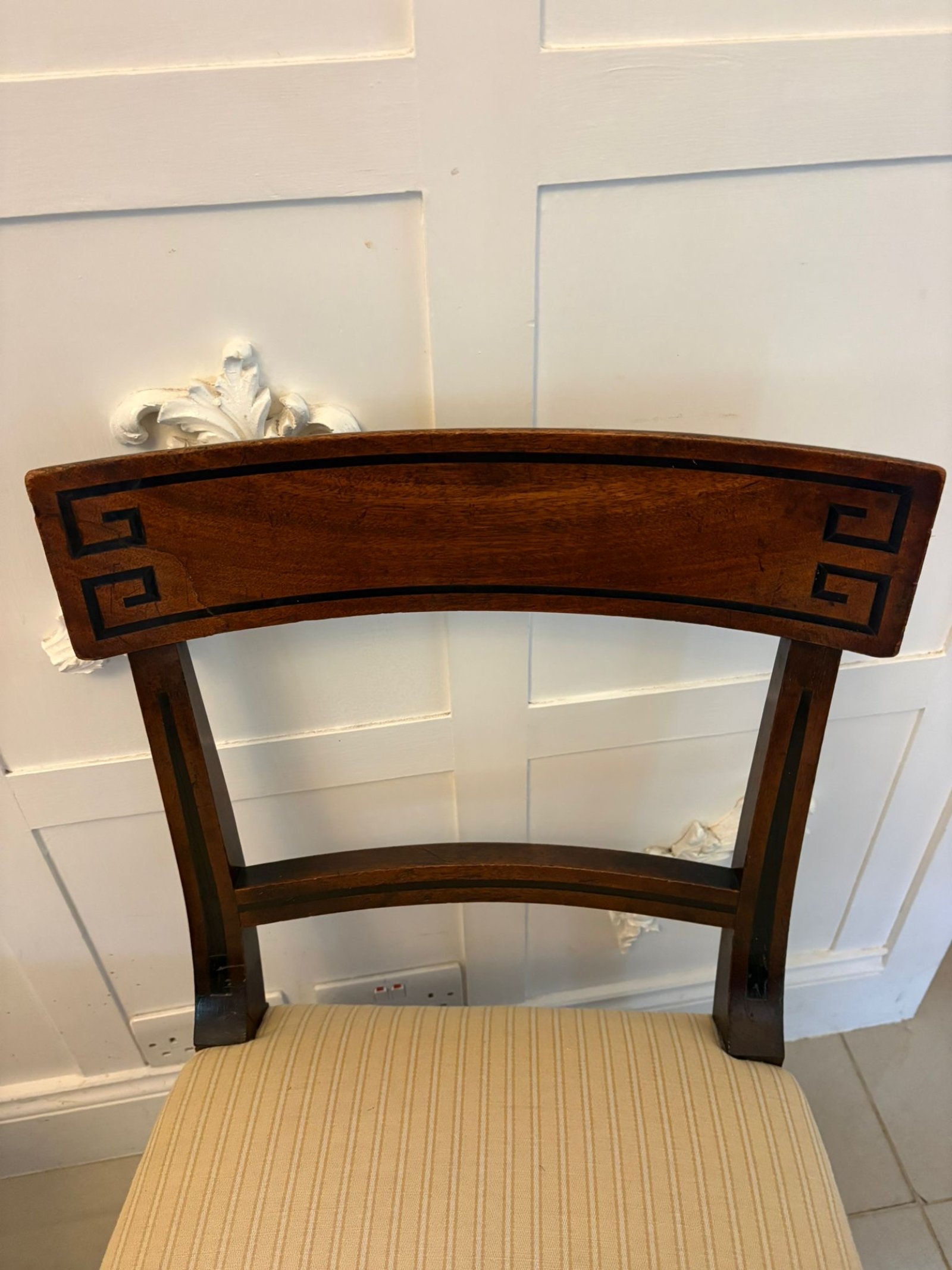 See shipping detailsA very elegant pair of antique English mahogany dining side chairs dating from the Regency period, early 19th century. The chairs are designed in the desirable Klismos form, with beautifully curved sabre legs and a shaped back rail decorated with fine ebony line inlay and distinctive Greek key corner detail.