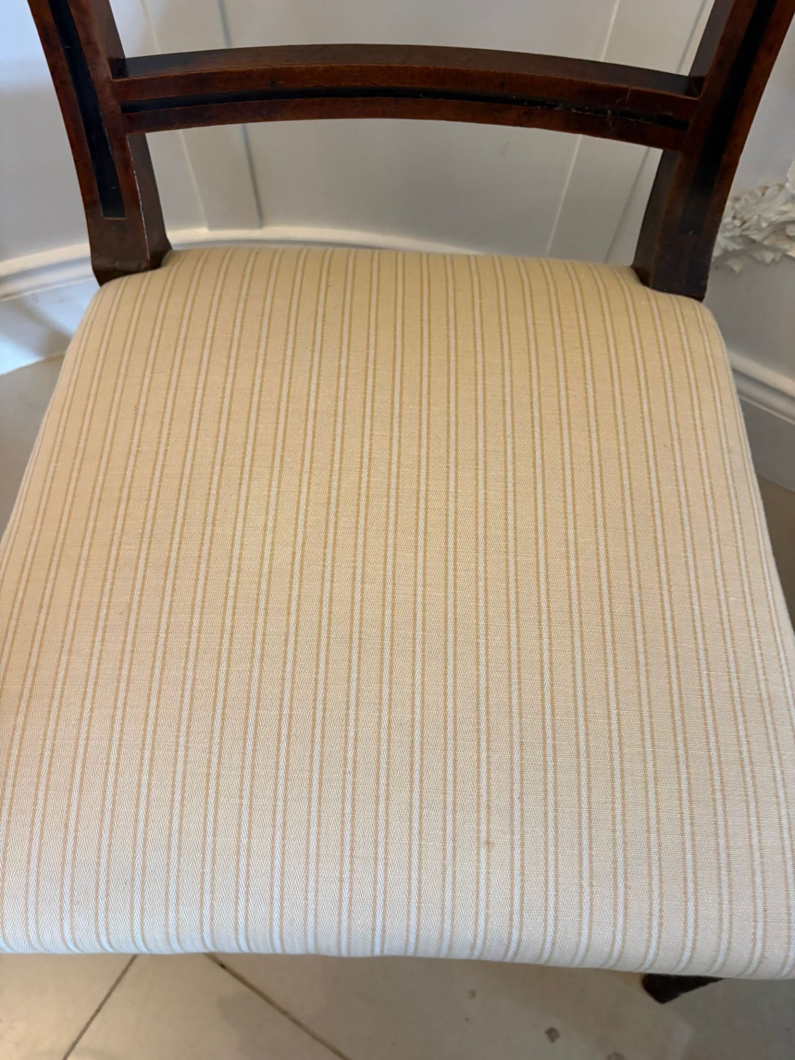 The seats are upholstered in a neutral striped fabric. One seat is slightly lighter in colour than the other. Most buyers purchasing a pair of chairs prefer to reupholster them to suit their own interior and we would be happy to reupholster the seats for the cost of the fabric only, or alternatively we can supply fabric from our own stock free of charge.