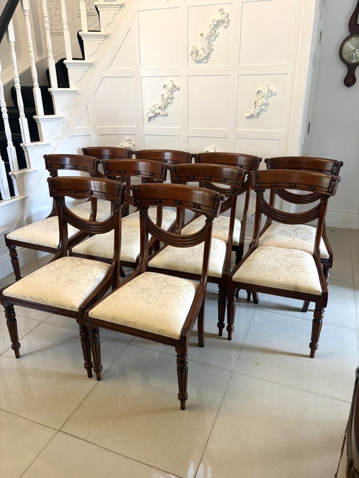 An antique English Regency style set of ten mahogany dining chairs, well made with elegant curved top rails and shaped backs featuring reeded and layered splat detail. Raised on turned and reeded front legs with swept rear supports, the chairs are finished in a rich warm mahogany tone and have been newly upholstered in a quality fabric.