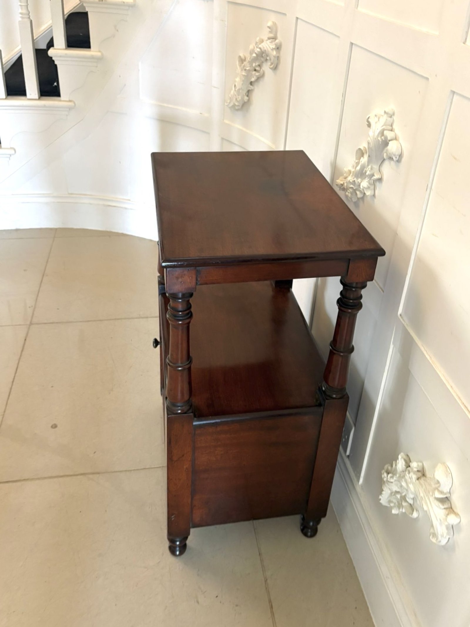 The turned supports and simple well-balanced proportions reflect practical Victorian design, while the use of mahogany gives the piece a more refined appearance than many everyday examples and shows it was made to a better standard.