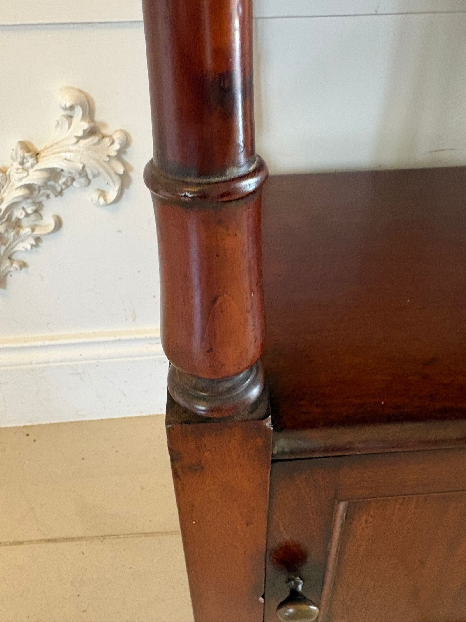 Originally designed as a bedside cupboard, often referred to as a pot cupboard, this piece would have been used in Victorian bedrooms before indoor plumbing. The lower cupboard was intended to house a chamber pot while the upper section provided space for a candle, water jug or personal items.
