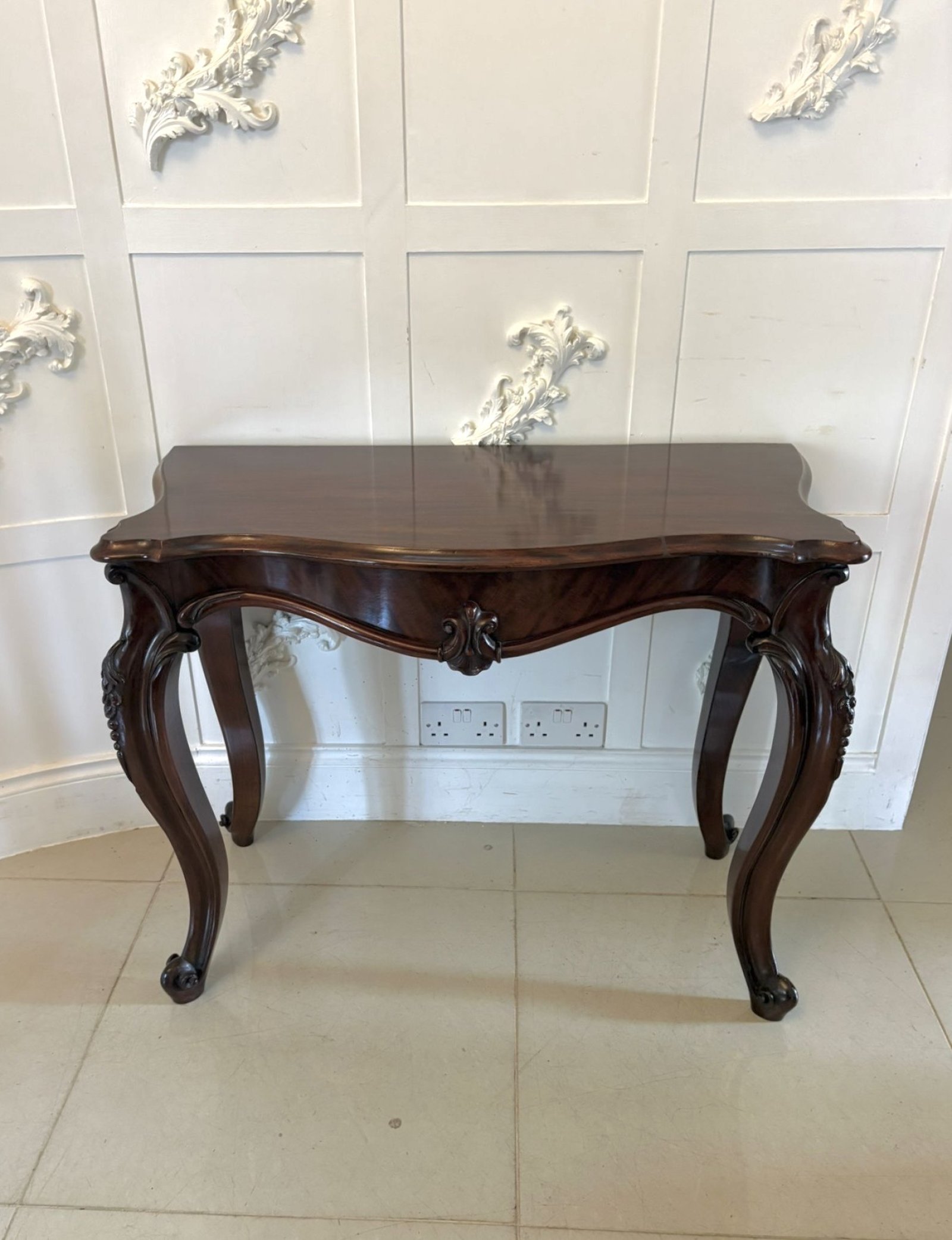An antique English Victorian mahogany serpentine console hall table, beautifully crafted in figured mahogany with a shaped top and elegant flowing outline. Raised on finely carved cabriole legs with scroll and foliate detail, the table features a shaped frieze centred with a decorative carved motif, all finished in a rich warm tone with lovely natural depth of colour.