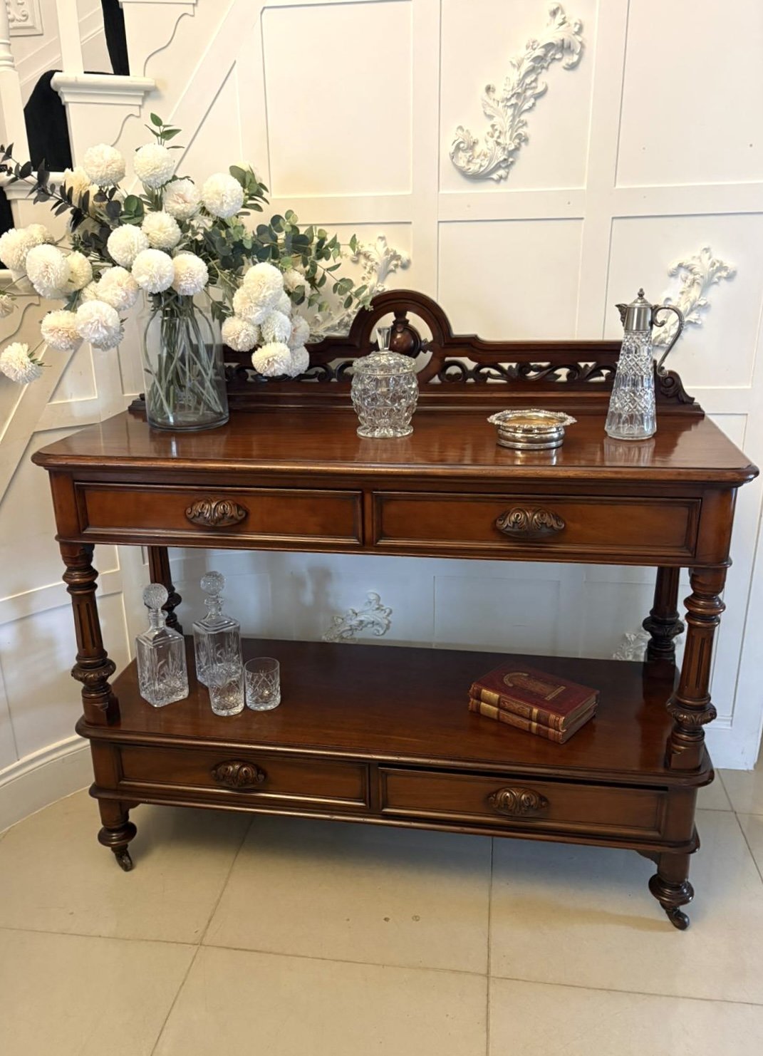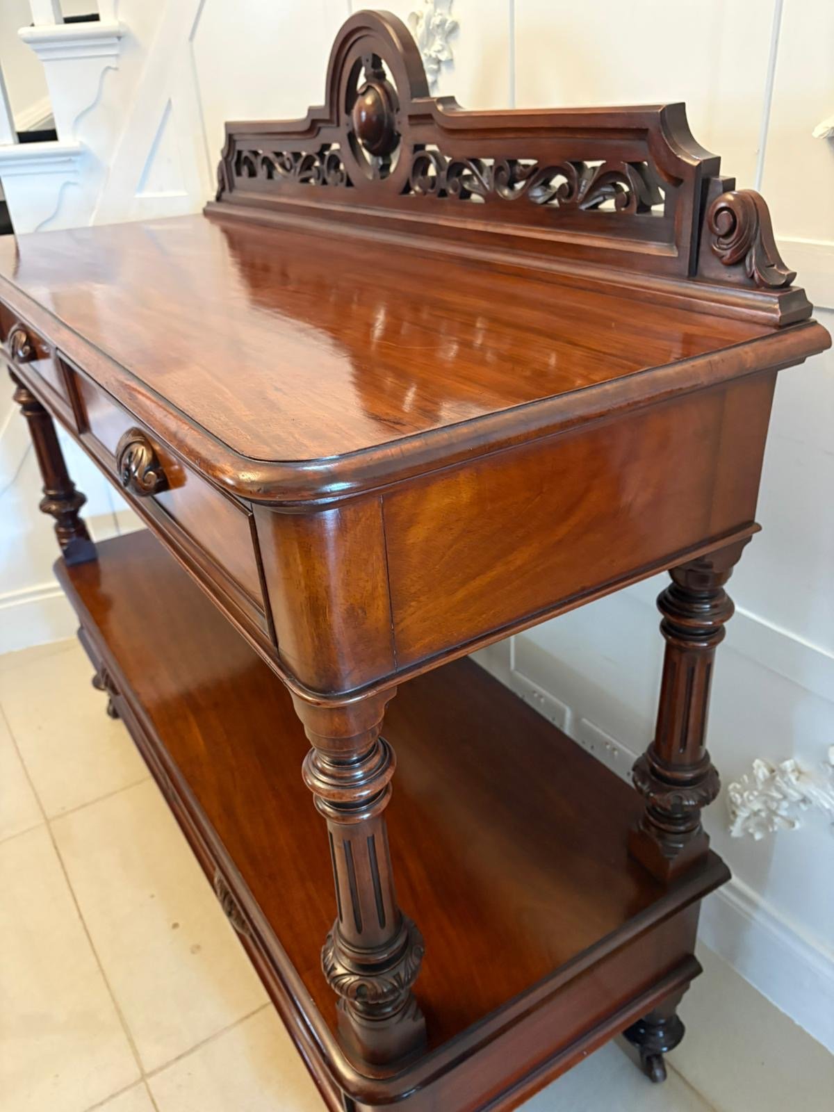See shipping detailsA superb antique Victorian mahogany two tier dumbwaiter of exceptional cabinet maker quality and proportions, more commonly used today as a sideboard or buffet server, raised on finely turned and fluted supports with original castors.