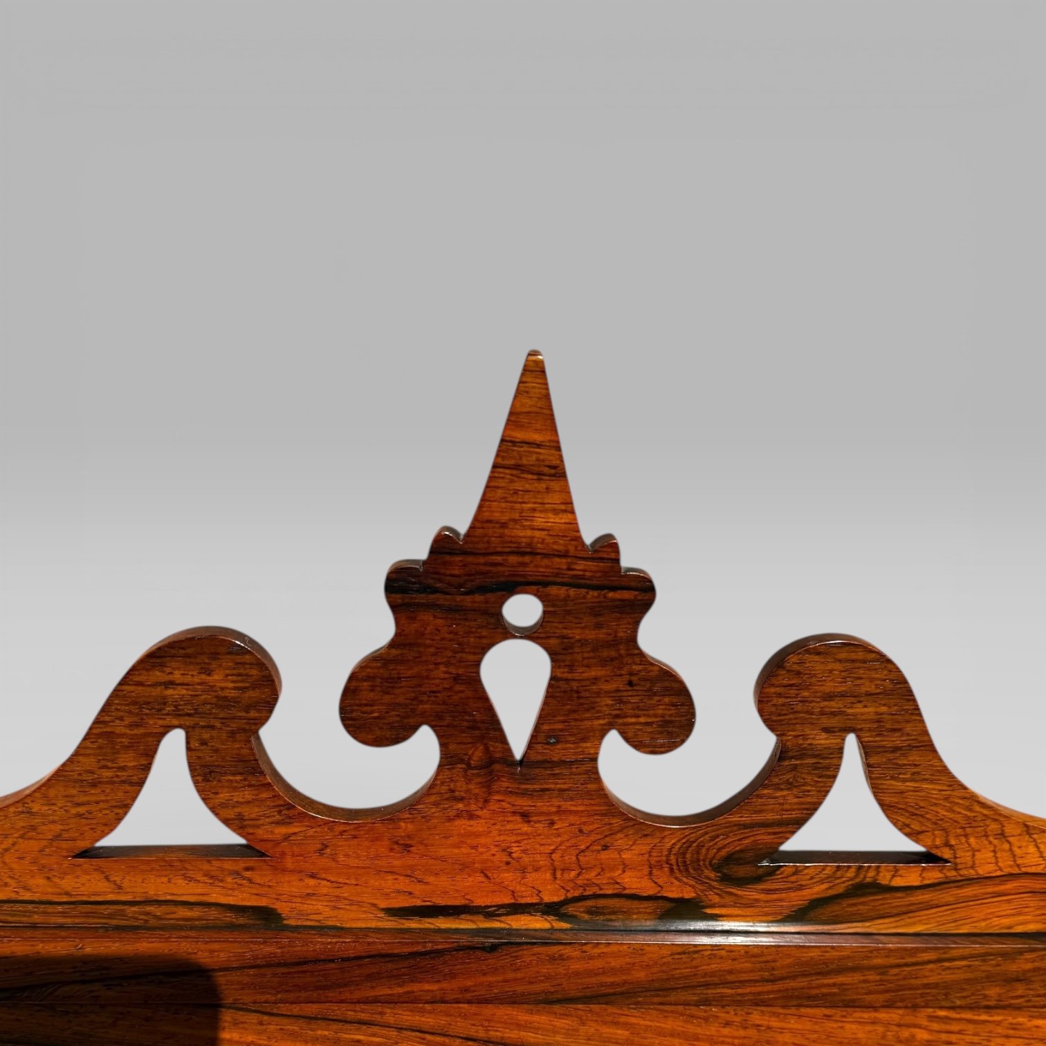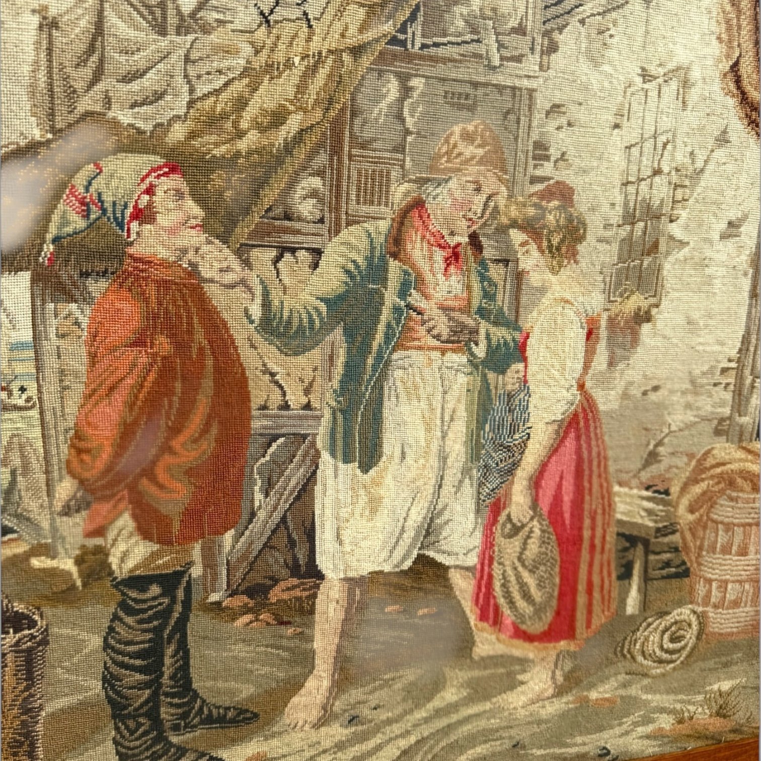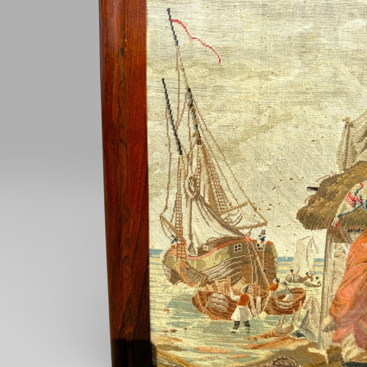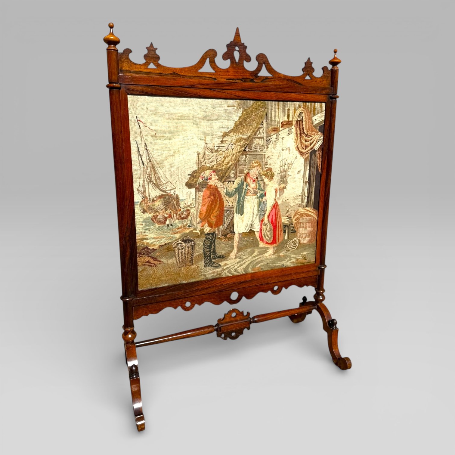 Here we have an antique English mid Victorian (1850-1870) Rosewood & Needlework Cheval Fire Screen. The needlework panel depicts a harbour scene with people talking with sailing boats and thatched houses in the background. Decorated to the top of the columns with spires and four further spires are located on this piece, one each side of the cheval feet. A turned stretcher joins the feet with a fretwork panel decoration joining these to the centre.