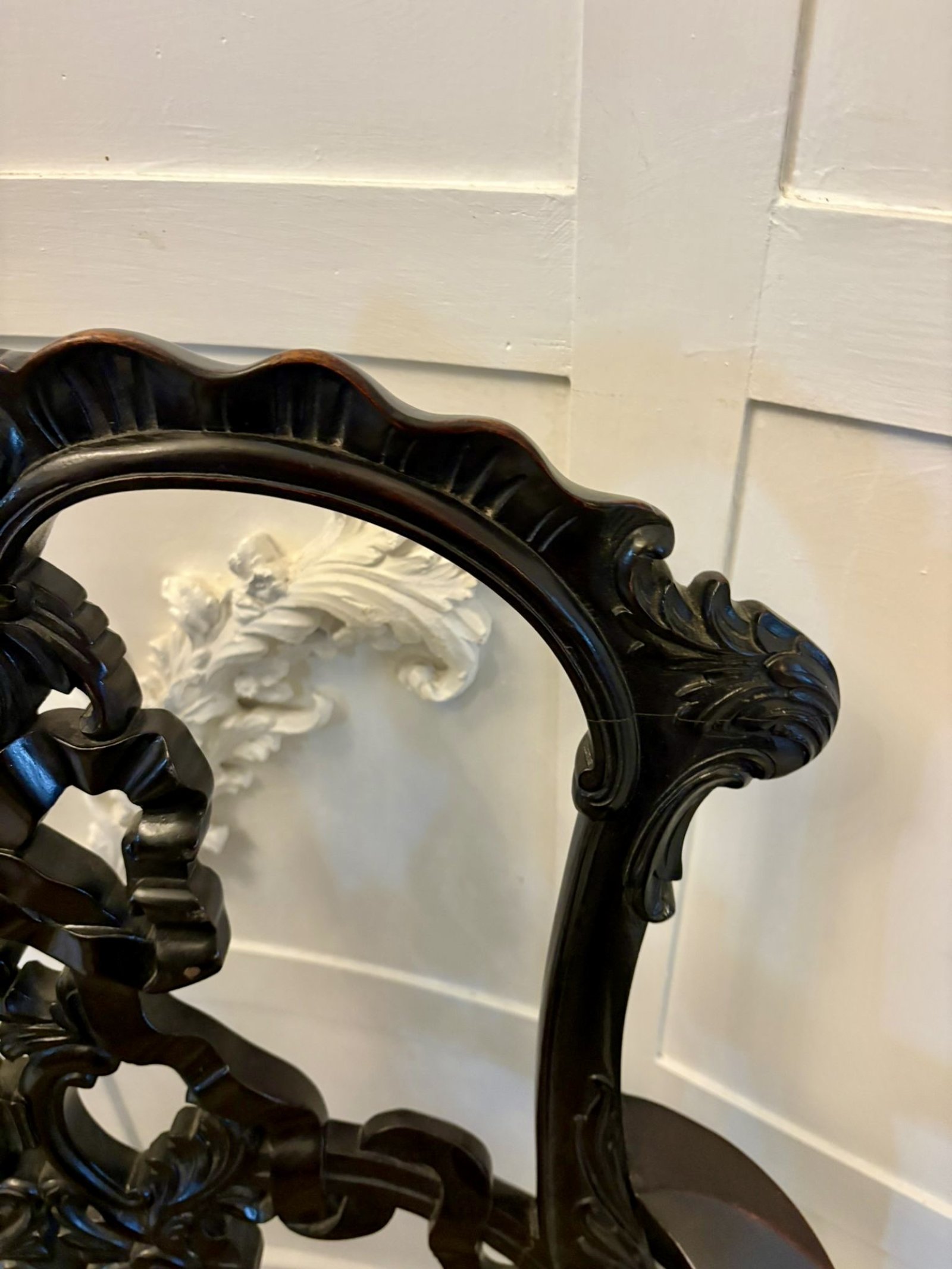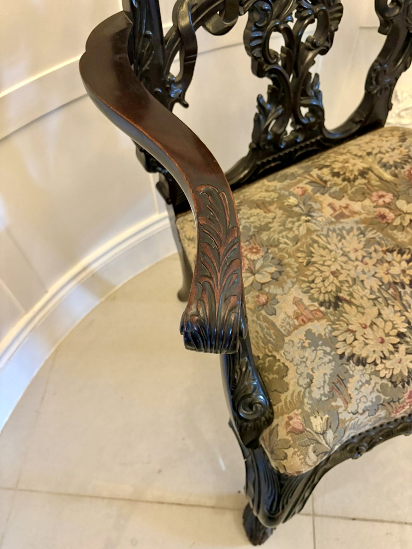 The carving is crisp and confident showing the skill of the maker and giving the chair real presence. The flowing arms and cabriole legs are equally well shaped terminating in carved feet that complete the design with elegance and balance.