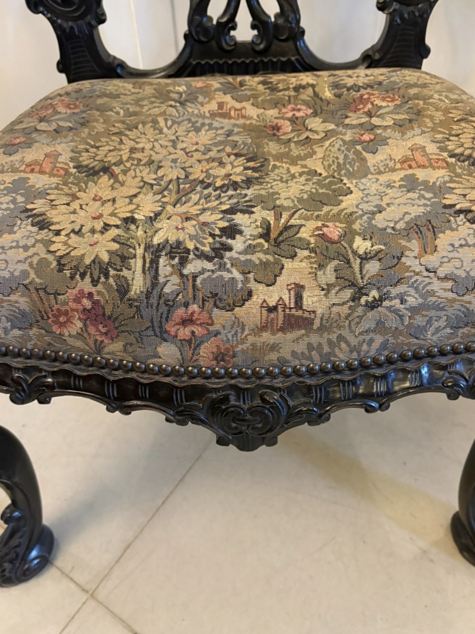 The chair retains a well shaped upholstered seat finished in a decorative tapestry fabric which complements the depth and richness of the mahogany. The frame has developed a deep warm patina over time further enhancing its quality.