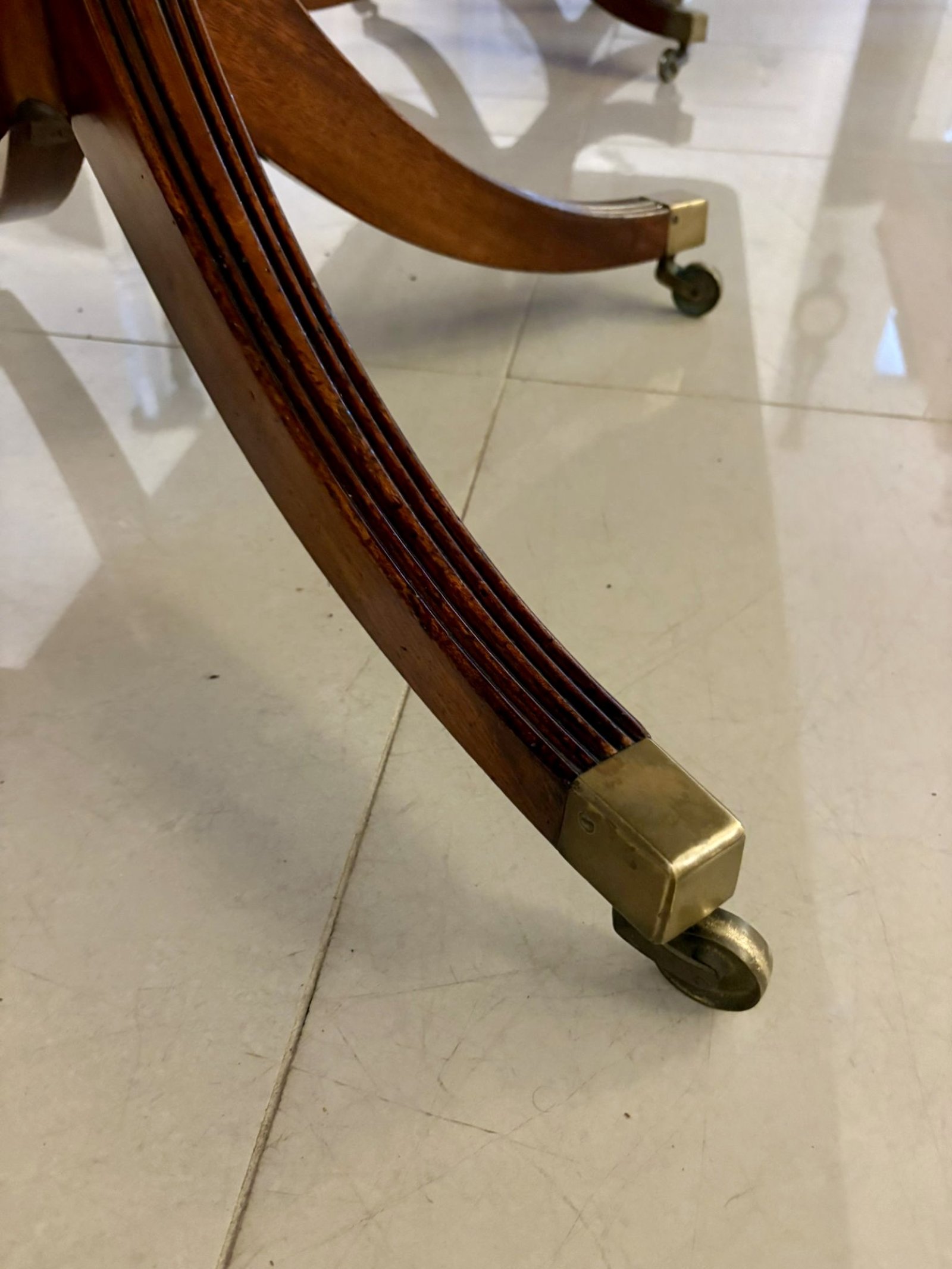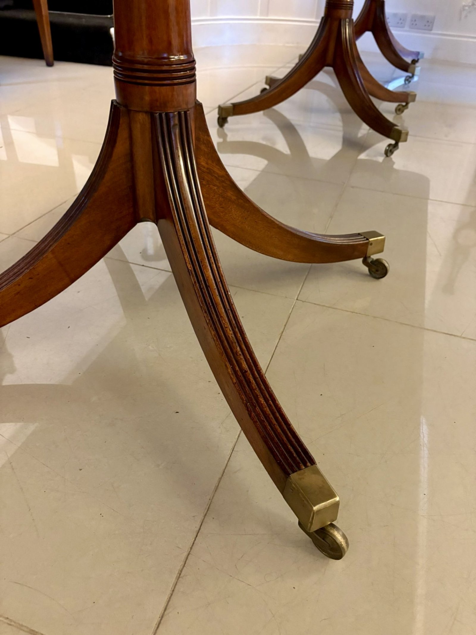 A substantial antique figured mahogany three-pillar extending dining table of classic rectangular form with softly rounded corners raised on three elegant reeded pedestal supports terminating in swept legs with original brass caps and castors. The top displays attractive, well-matched mahogany figuring with a rich, even tone and a well-developed patina.