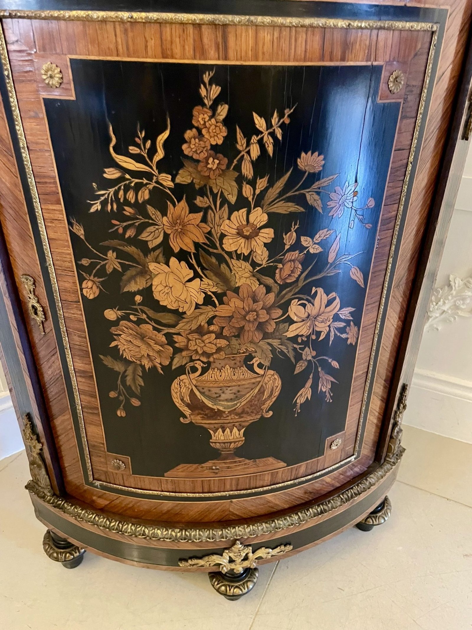 The cabinet is veneered in richly figured kingwood and tulipwood accented with ebonised borders and finely cast ormolu mounts, including rosettes, ribbon-tied garlands and classical acanthus leaf ornaments. It stands on turned feet with gilt-bronze sabots.