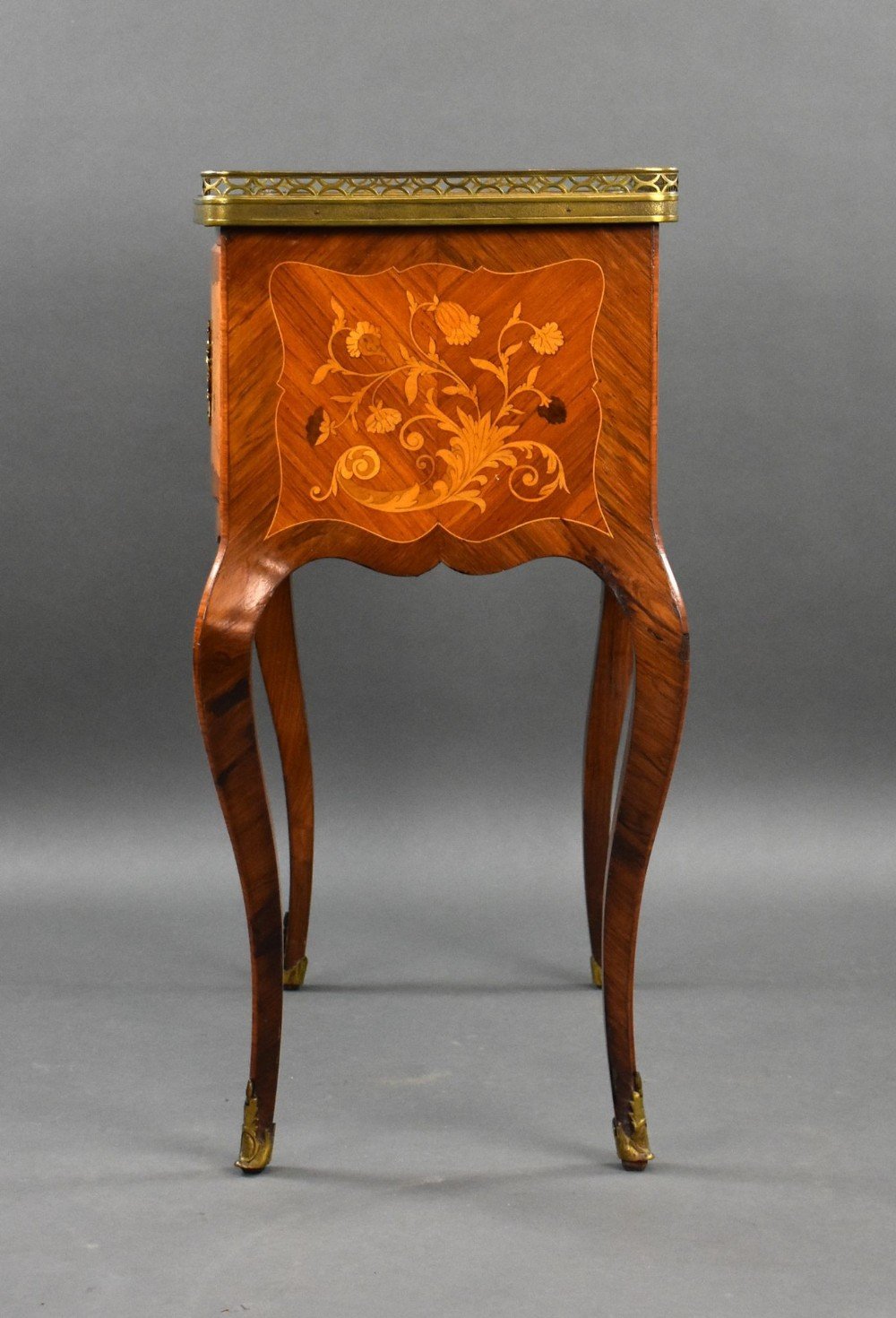 For sale is a good quality antique French marquetry side cabinet, of bowed form, with a three quarter pierced brass gallery, having a pair of marquetry inlaid cupboard doors below, standing on delicate cabriole legs. This piece remains in good condition, showing minor losses commensurate with age and use.