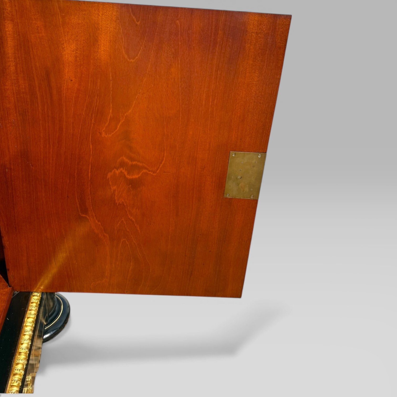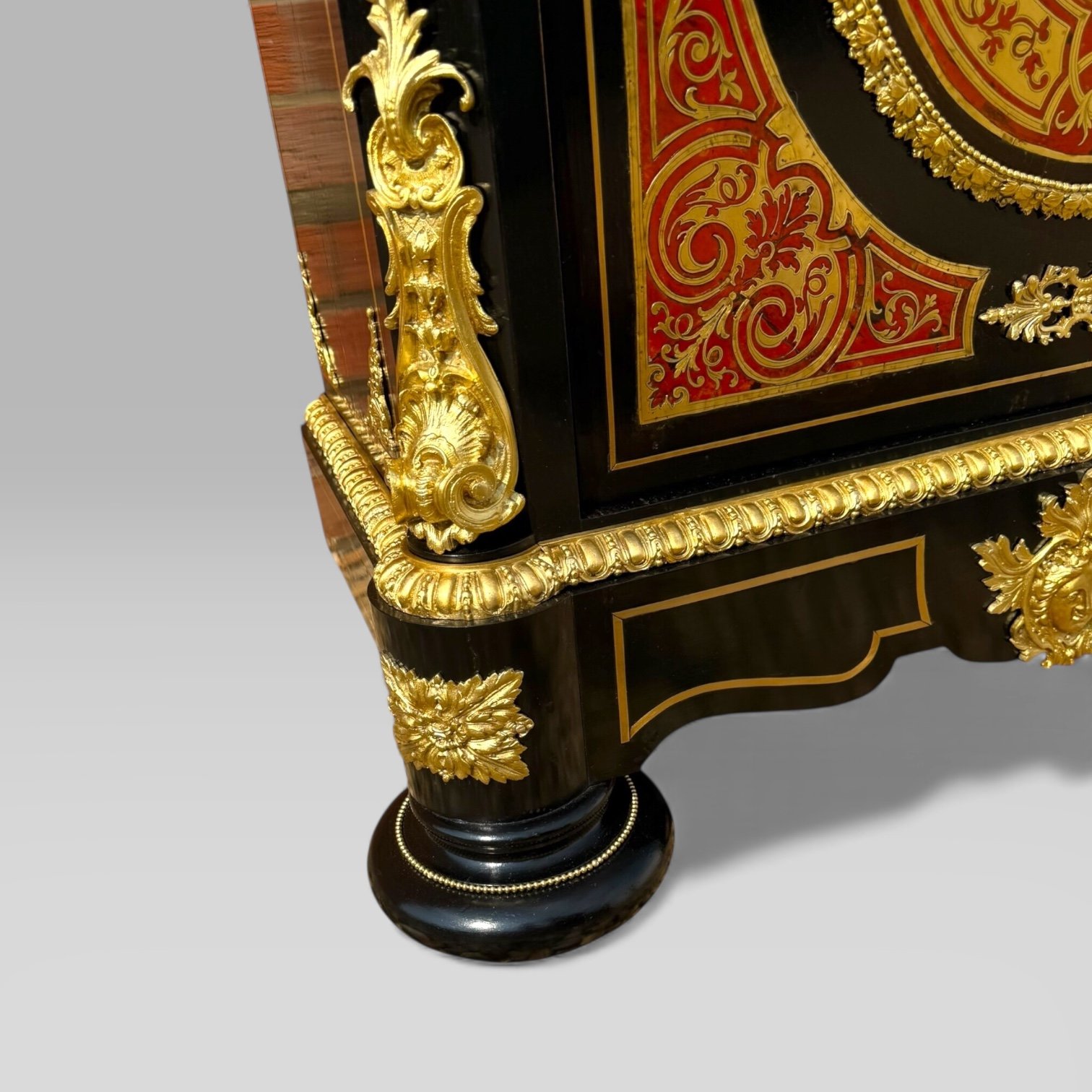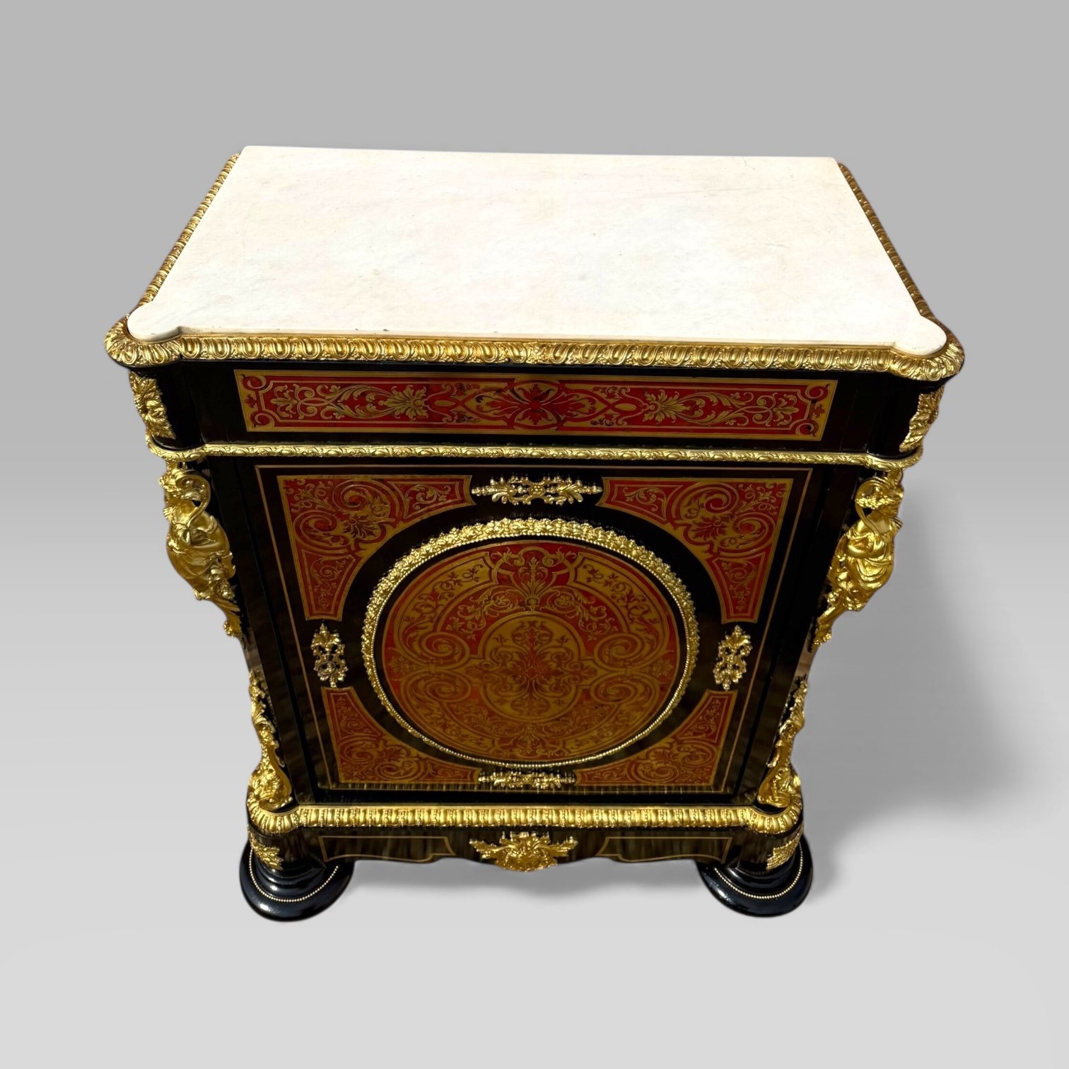 Here we have a French Napoleon III period (1852-1870) Ebonised & Boulle marble topped pier cabinet. This cabinet is in excellent condition with an intricate symmetrical arabesque style boulle inlay to the front and is a wonderful example of quality 19th century boulle work. The exterior is detailed from top to bottom with brass accents and brass inlay to both the front, the sides and the frieze. To the front corners are two impressive brass lady figures representing a Greek god and on each side is a further two brass faces of ladies representing another Greek god. The base is standing on two large impressive bun feet with brass beading surrounding each.