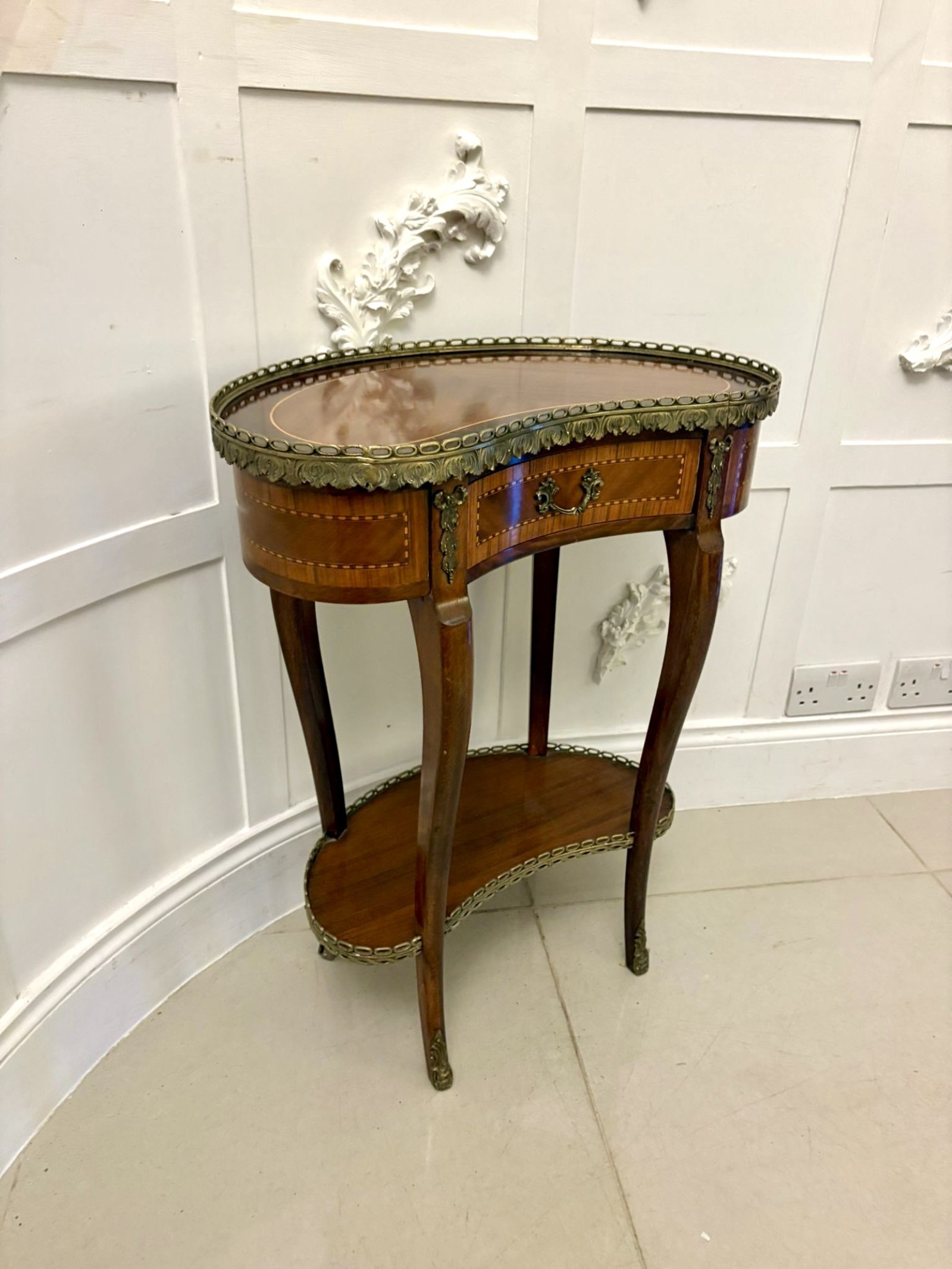 A fine antique French Louis XV style kidney-shaped occasional table of elegant, refined form. The shaped top is beautifully veneered in well-chosen mahogany with satinwood crossbanding, enclosed within an ornate pierced brass gallery. Beneath the top sits a single frieze drawer retaining its original decorative brass handle and classical ormolu mounts to the corners.