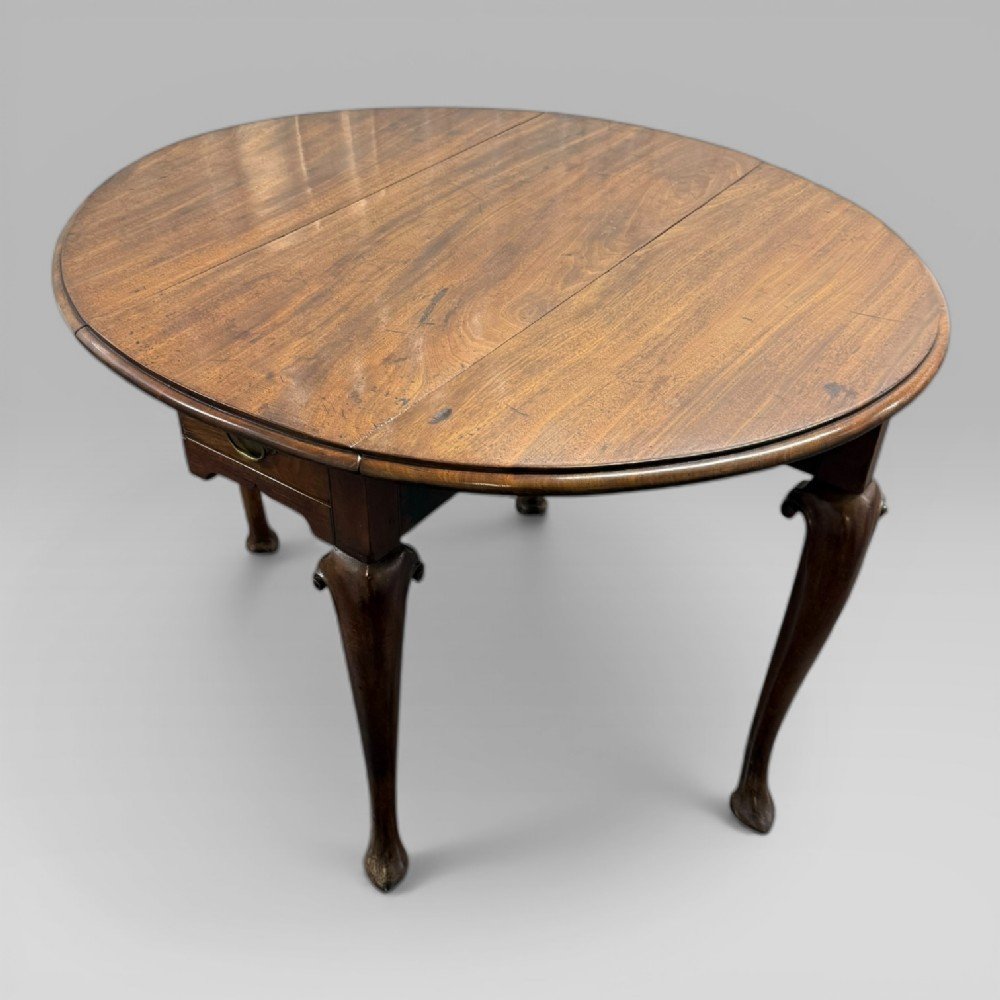 See shipping detailsAn antique George II mahogany oval drop leaf dining table (1727–1760), with a hinged oval top and shaped apron. The table is fitted with a drawer to one end, currently with a plain Georgian brass handle. There is evidence that the drawer originally had a drop handle, which has been replaced at a later date. The drawer is oak lined.