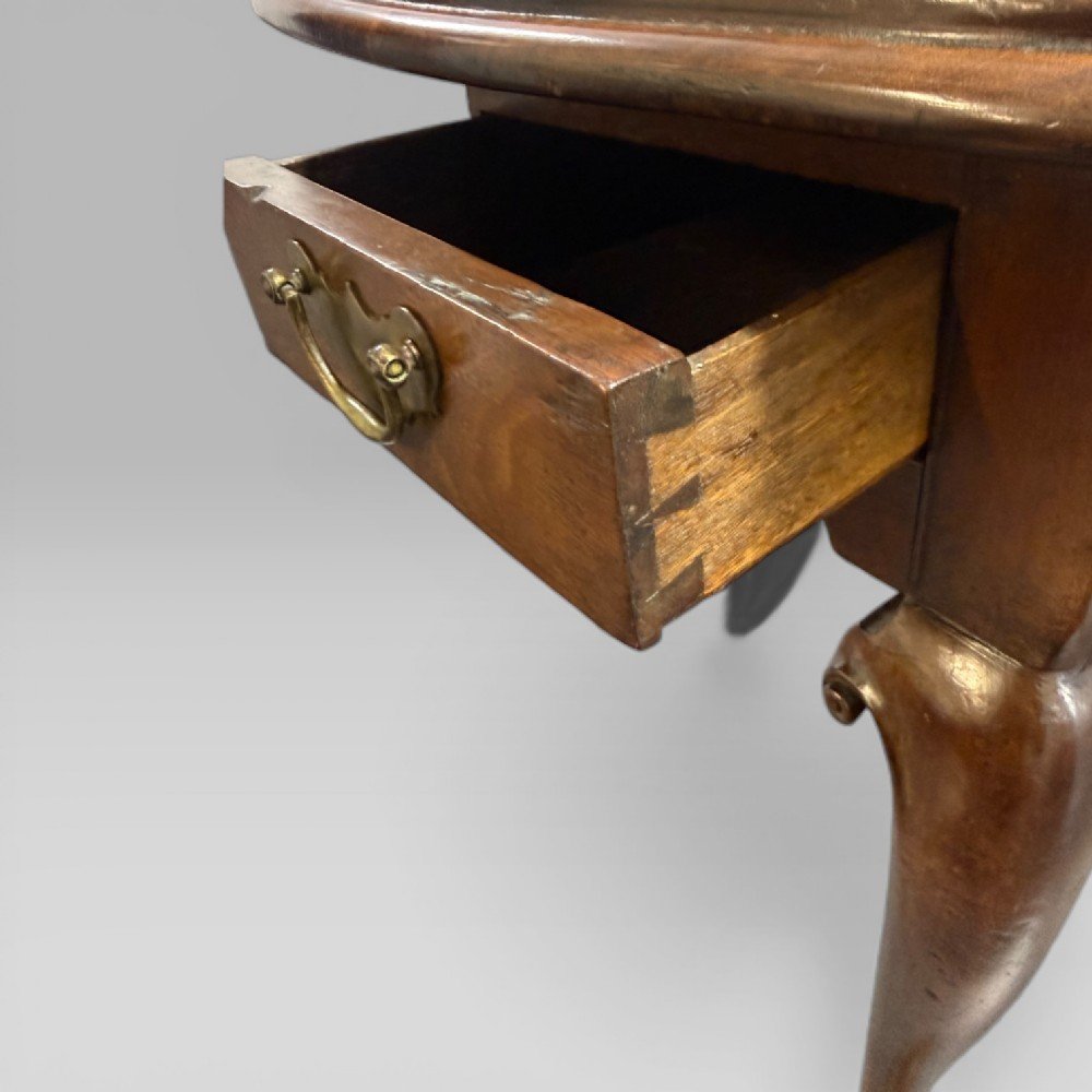 The table stands on cabriole legs terminating in pointed pad feet, with a concave shaping to the rear of each foot.