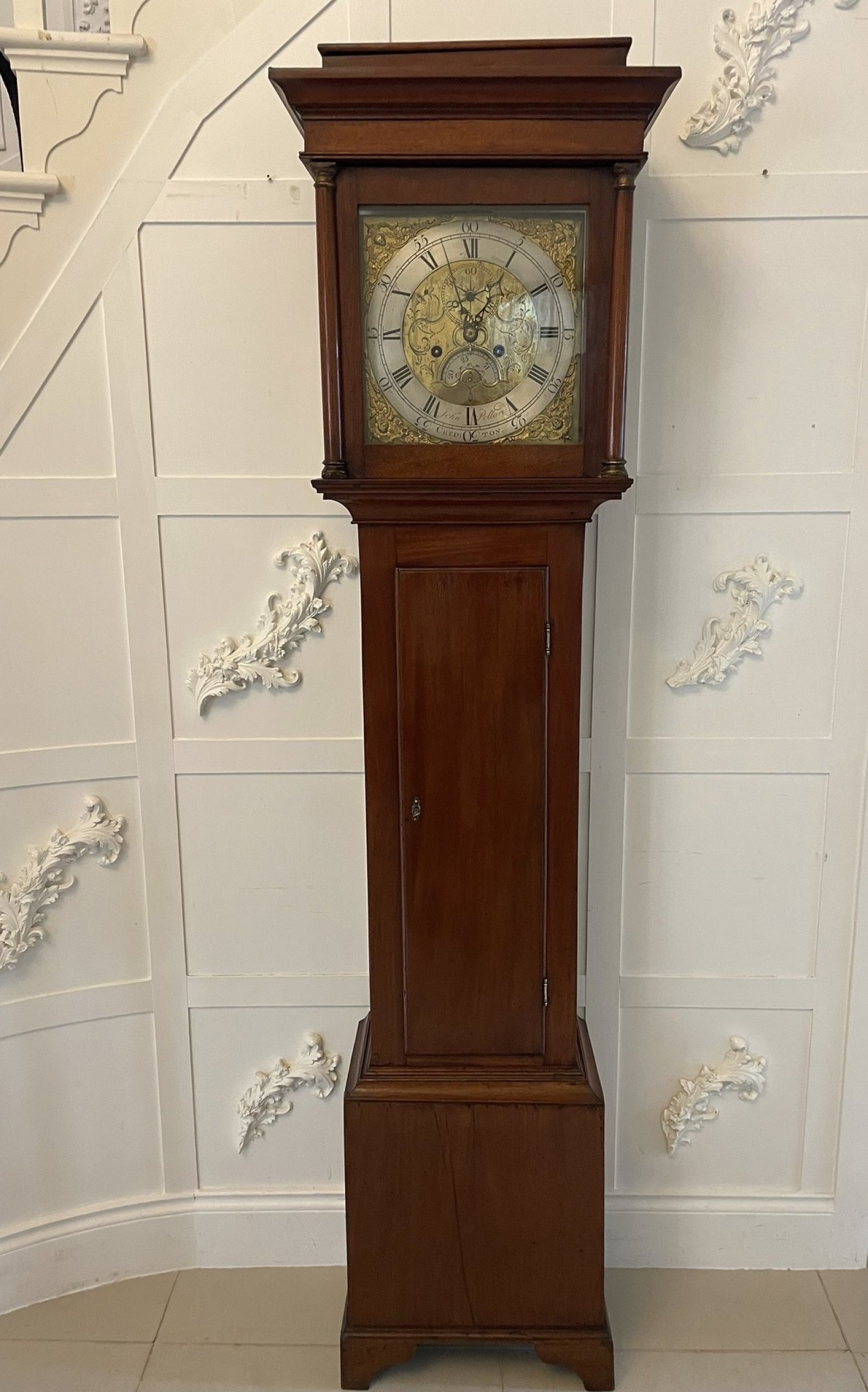 Antique George III 18th century quality brass faced 8 day longcase clock by John Pollard of Crediton having a superb quality mahogany case on original bracket feet, ornate square brass dial with second hand, date, dial, original hands and an 8 day movement striking on the hour and half hour on a bell with original weights, pendulum and winding key