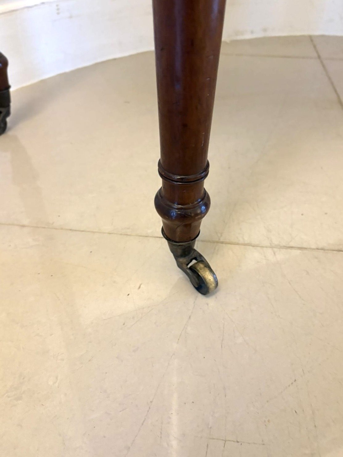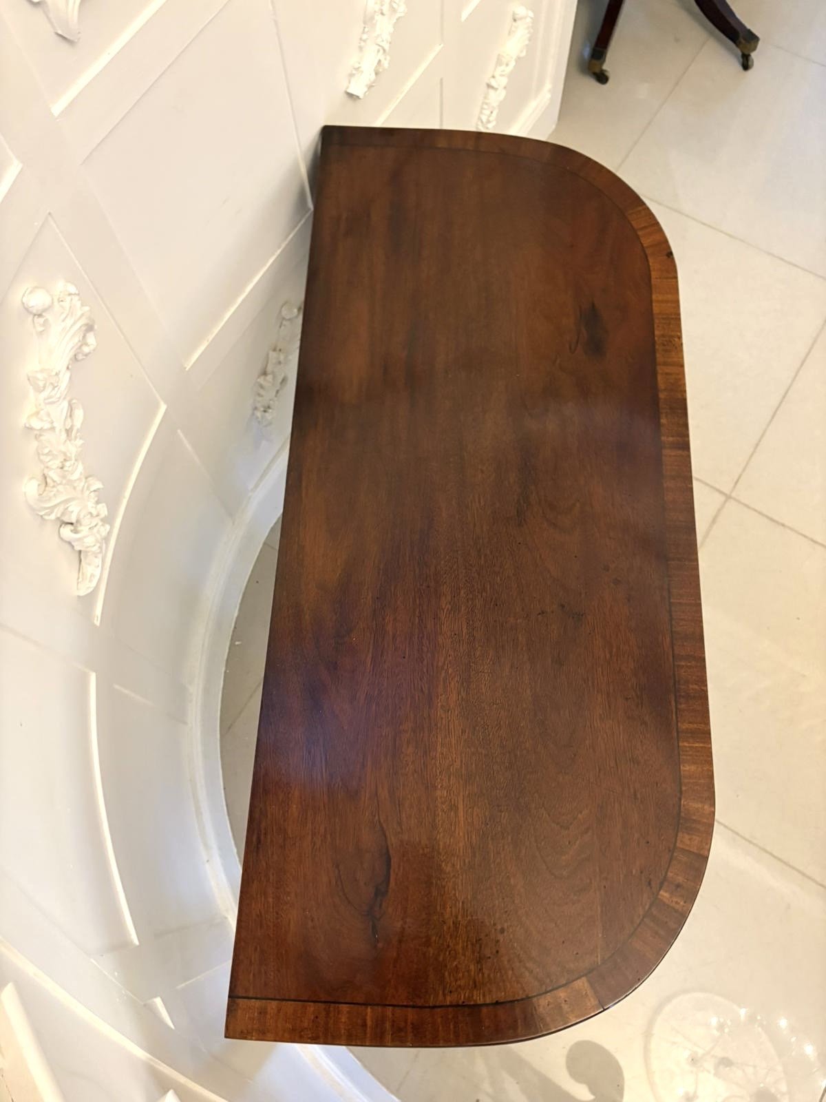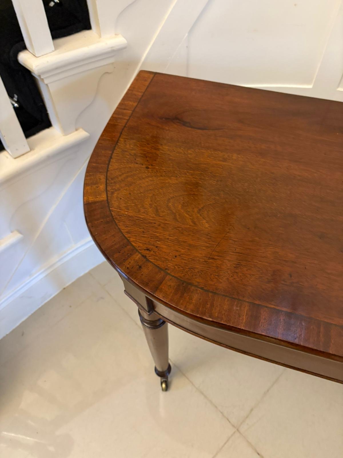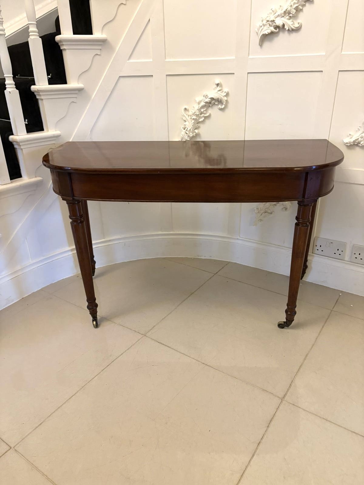 Antique George III figured mahogany console table having a quality figured mahogany top with a crossbanded edge above a mahogany frieze standing on four elegant turned tapering legs with original brass cup castors