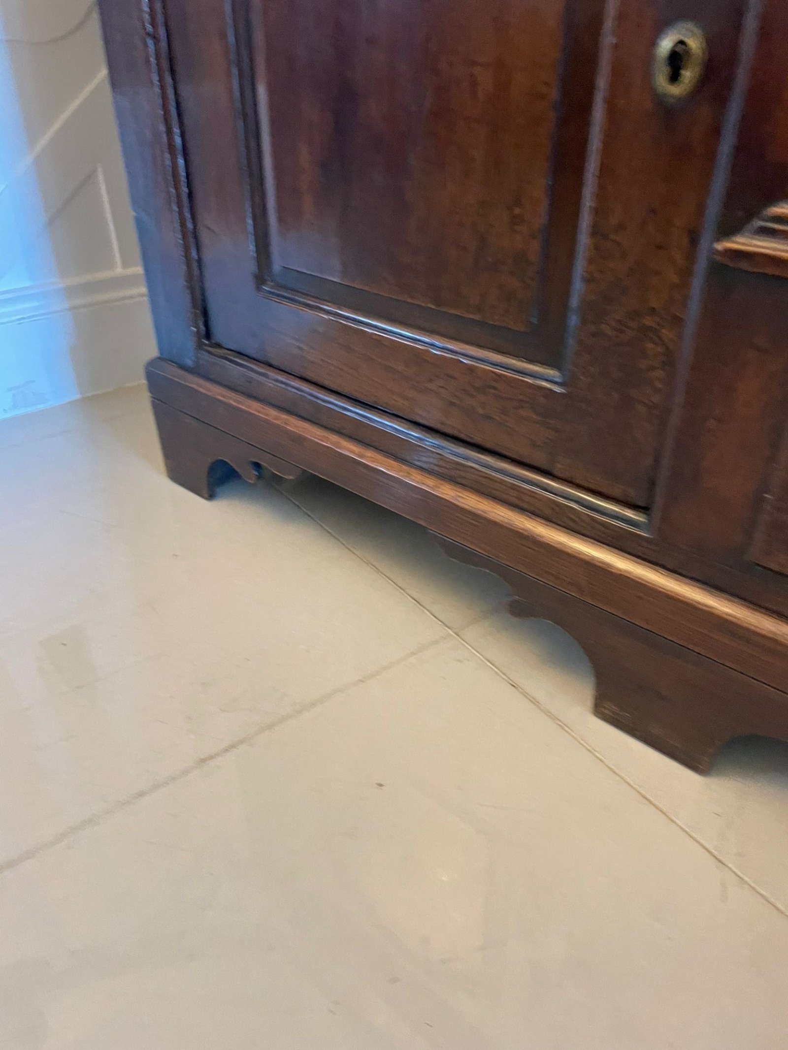 Antique George III outstanding quality oak Welsh dresser and original plate rack having an outstanding quality oak plate rack with original oak boards to the back, attractive carved frieze, three shelves, shaped sides above a magnificent dresser base having six oak lined drawers with brass swan neck handles, two doors with shaped panels opening to reveal a shelf and storage area, panelled sides standing on original bracket feet